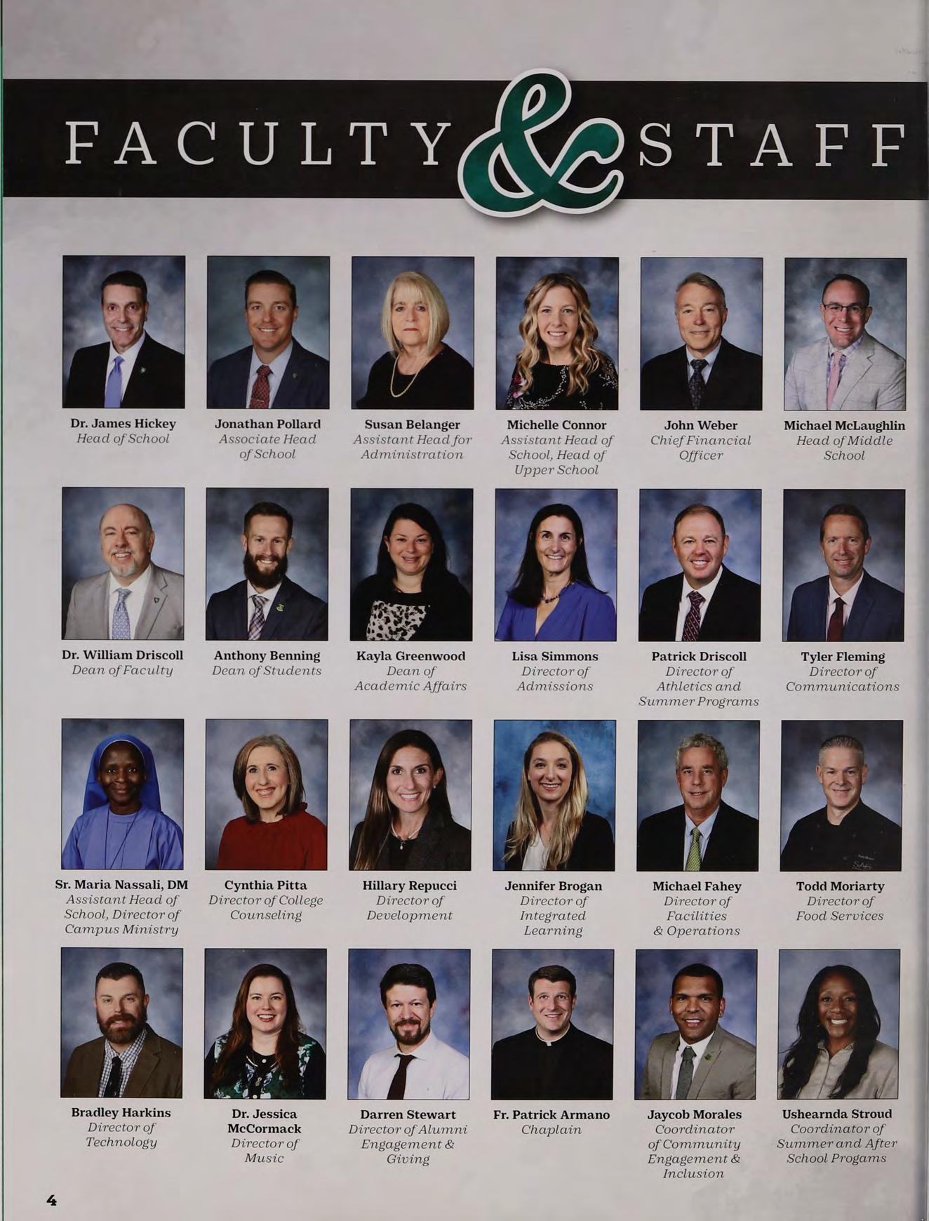 Dr. James Hickey Jonathan Pollard Susan Belanger Michelle Connor John Weber Michael McLaughlin Head of School Associate Head Assistant Head for Assistant Head of Chief Financial Head of Middle of School Administration School, Head of Officer School Upper School