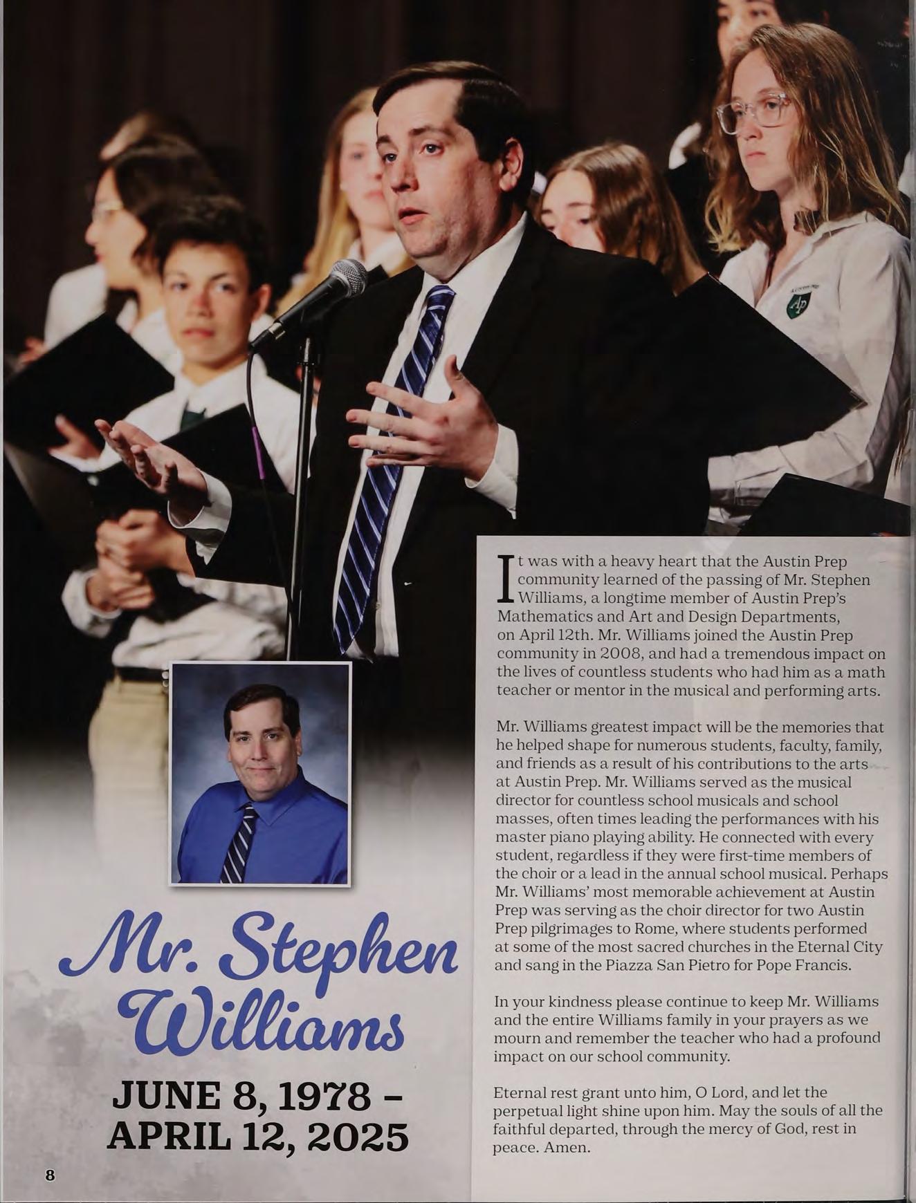 t was with a heavy heart that the Austin Prep community learned of the passing of Mr. Stephen Williams, a longtime member of Austin Prep’s Mathematics and Art and Design Departments, on April 12th. Mr. Williams joined the Austin Prep community in 2008, and had a tremendous impact on the lives of countless students who had him as a math teacher or mentor in the musical and performing arts.