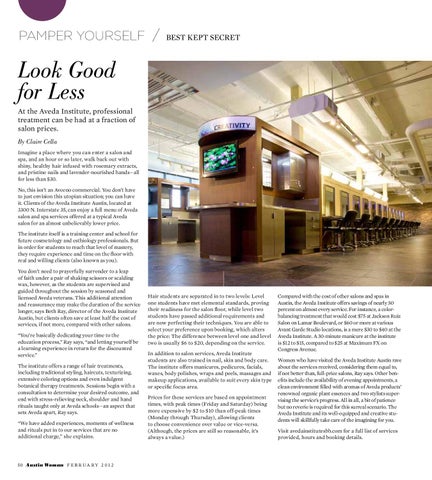 Look Good for Less At the Aveda Institute, professional treatment can be had at a fraction of salon prices. By Claire Cella Imagine a place where you can enter a salon and spa, and an hour or so later, walk back out with shiny, healthy hair infused with rosemary extracts, and pristine nails and lavender-nourished hands—all for less than $30. No, this isn’t an Aveeno commercial. You don’t have to just envision this utopian situation; you can have it. Clients of the Aveda Institute Austin, located at 3300 N. Interstate 35, can enjoy a full menu of Aveda salon and spa services offered at a typical Aveda salon for an almost unbelievably lower price. The institute itself is a training center and school for future cosmetology and esthiology professionals. But in order for students to reach that level of mastery, they require experience and time on the floor with real and willing clients (also known as you). You don’t need to prayerfully surrender to a leap of faith under a pair of shaking scissors or scalding wax, however, as the students are supervised and guided throughout the session by seasoned and licensed Aveda veterans. This additional attention and reassurance may make the duration of the service longer, says Beth Ray, director of the Aveda Institute Austin, but clients often save at least half the cost of services, if not more, compared with other salons. “You’re basically dedicating your time to the education process,” Ray says, “and letting yourself be a learning experience in return for the discounted service.” The institute offers a range of hair treatments, including traditional styling, haircuts, texturizing, extensive coloring options and even indulgent botanical therapy treatments. Sessions begin with a consultation to determine your desired outcome, and end with stress-relieving neck, shoulder and hand rituals taught only at Aveda schools—an aspect that sets Aveda apart, Ray says. “We have added experiences, moments of wellness and rituals put in to our services that are no additional charge,” she explains.