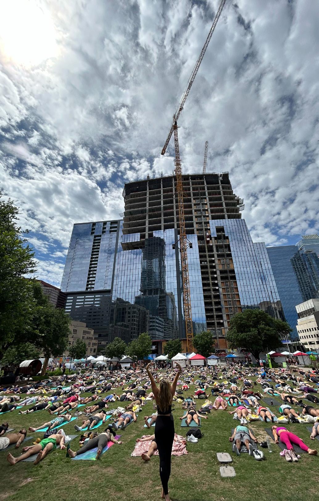 A large crowd enjoys a meditative and restorative yoga class led by Liz Davis at the 2nd Annual Singles Yoga event by Swift Fit Events, April 2024.