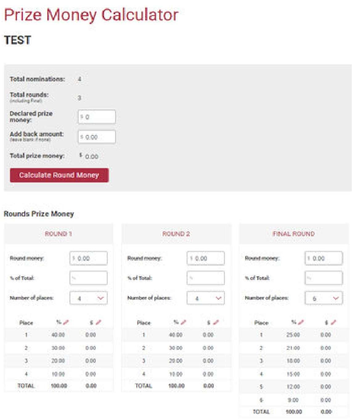 Prize Money Summary: Lets you review and edit payouts for each round before finalising