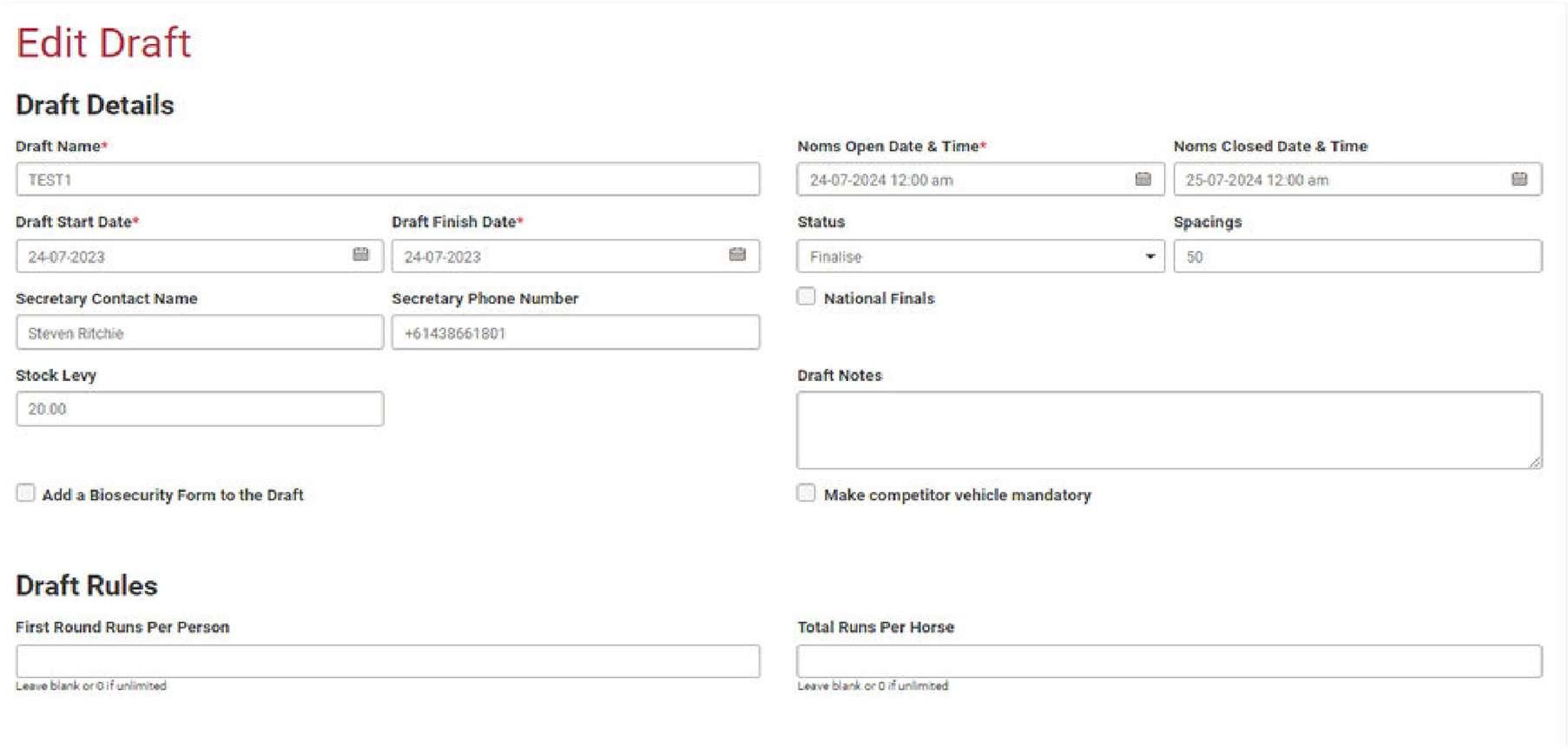 While setting up for campdraft events, you may add an event for stables or catering to collect expressions of interest (EOIs) from competitors.