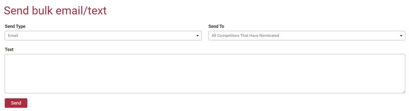 Navigate to the Nomination Dashboard and click on your draft name Click Send bulk email/text button. Write message in test box. NOTE: message is limited to 500 characters.