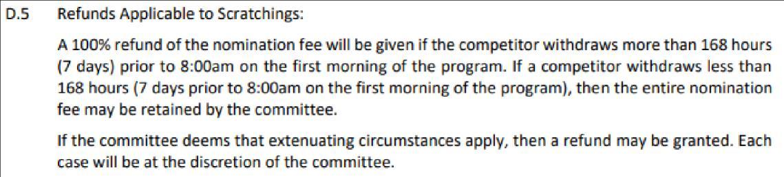 Refund Full Amount: Full refund given typically scratched more than 7 days before the event or extenuating circumstances approved