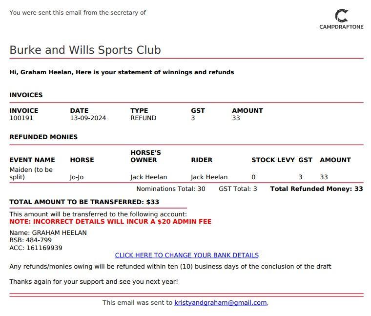 • Indicates invoice was sent with refund/prizemoney breakdown