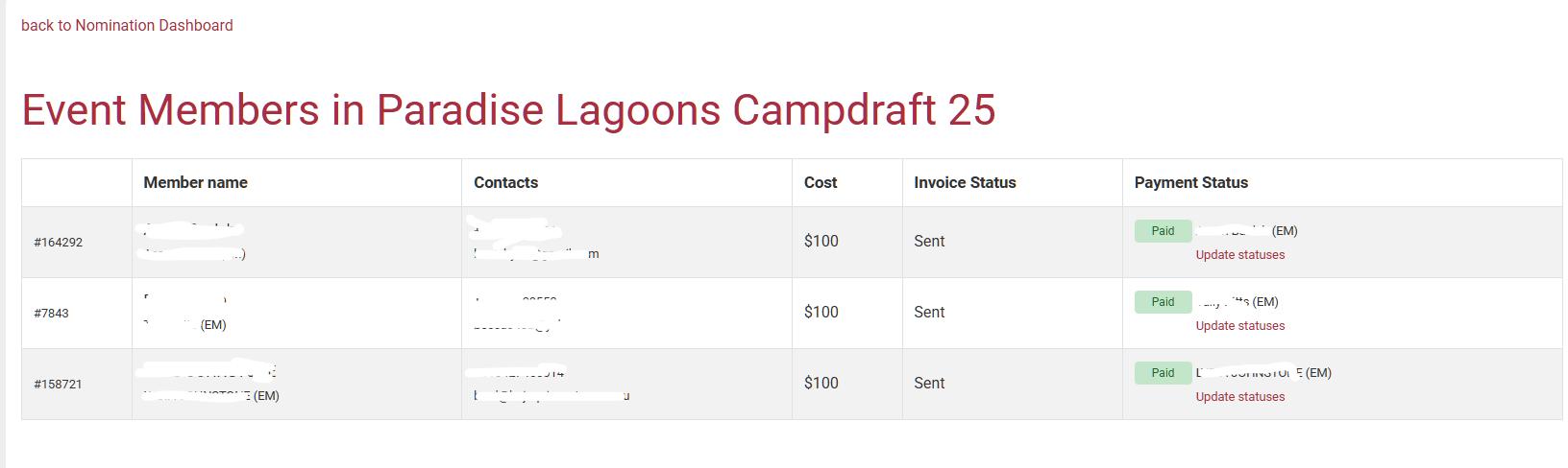 IT IS OF THE UPMOST IMPORTANCE TO MARK YOUR EVENT MEMBERS AS PAID FOR THEIR EVENT MEMBERSHIP This is not the same as marking their nominations as paid.