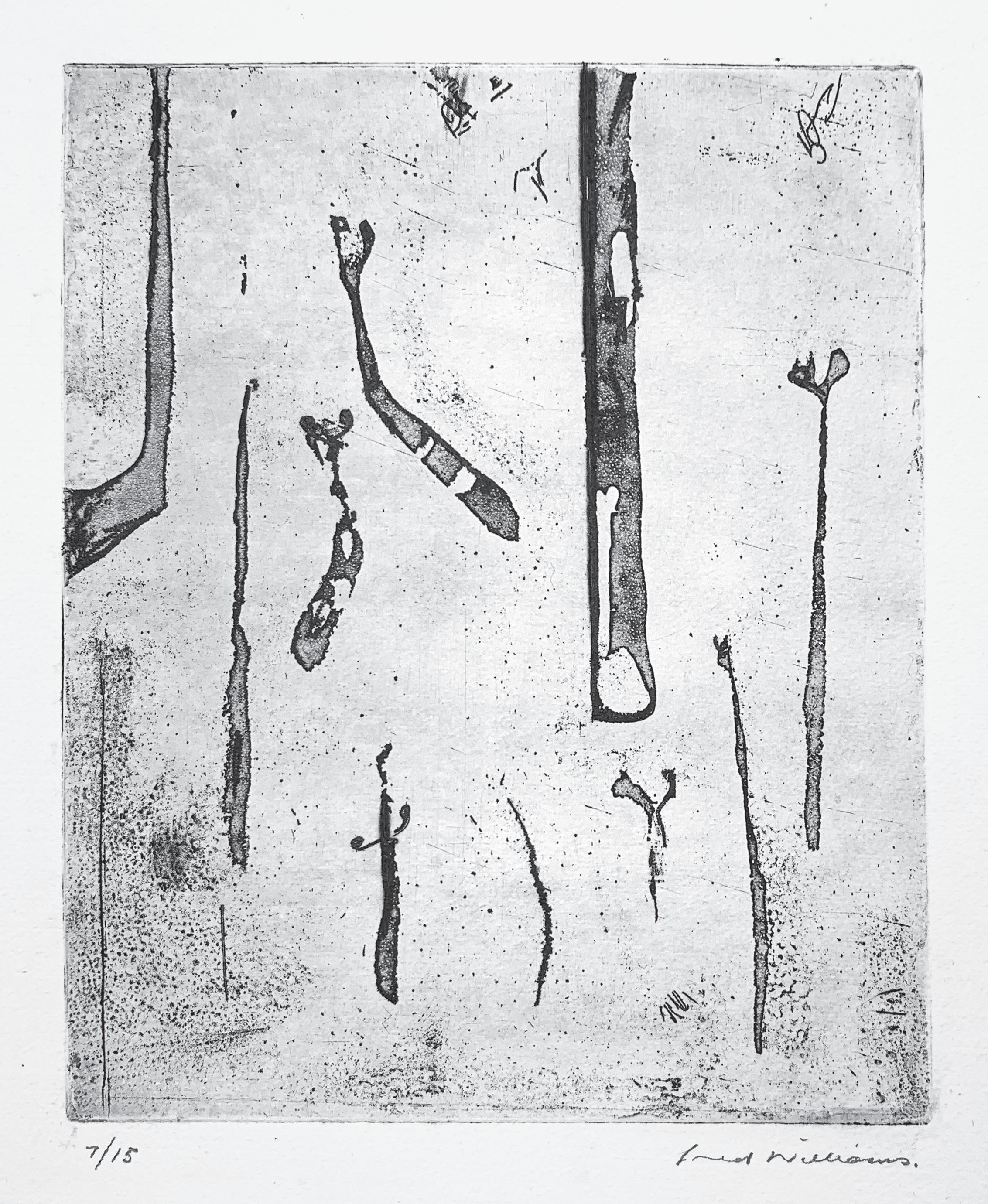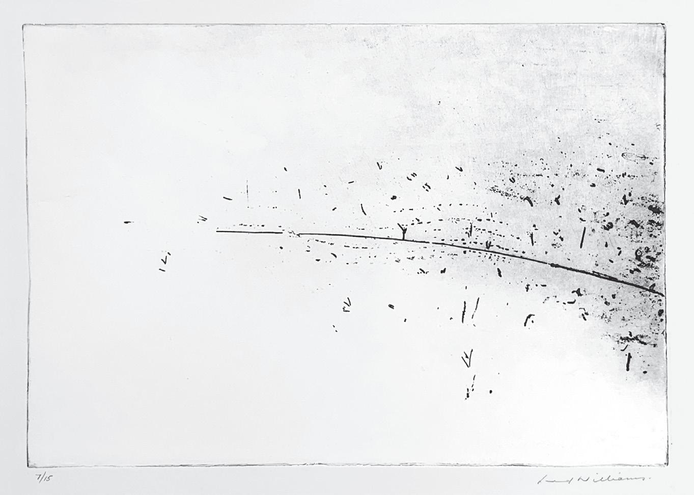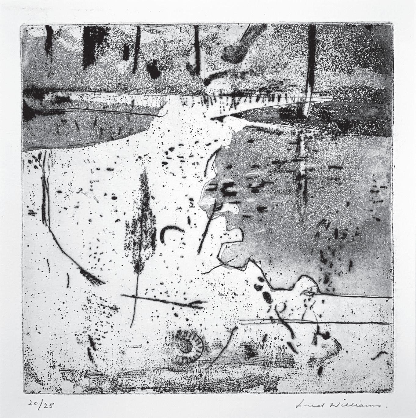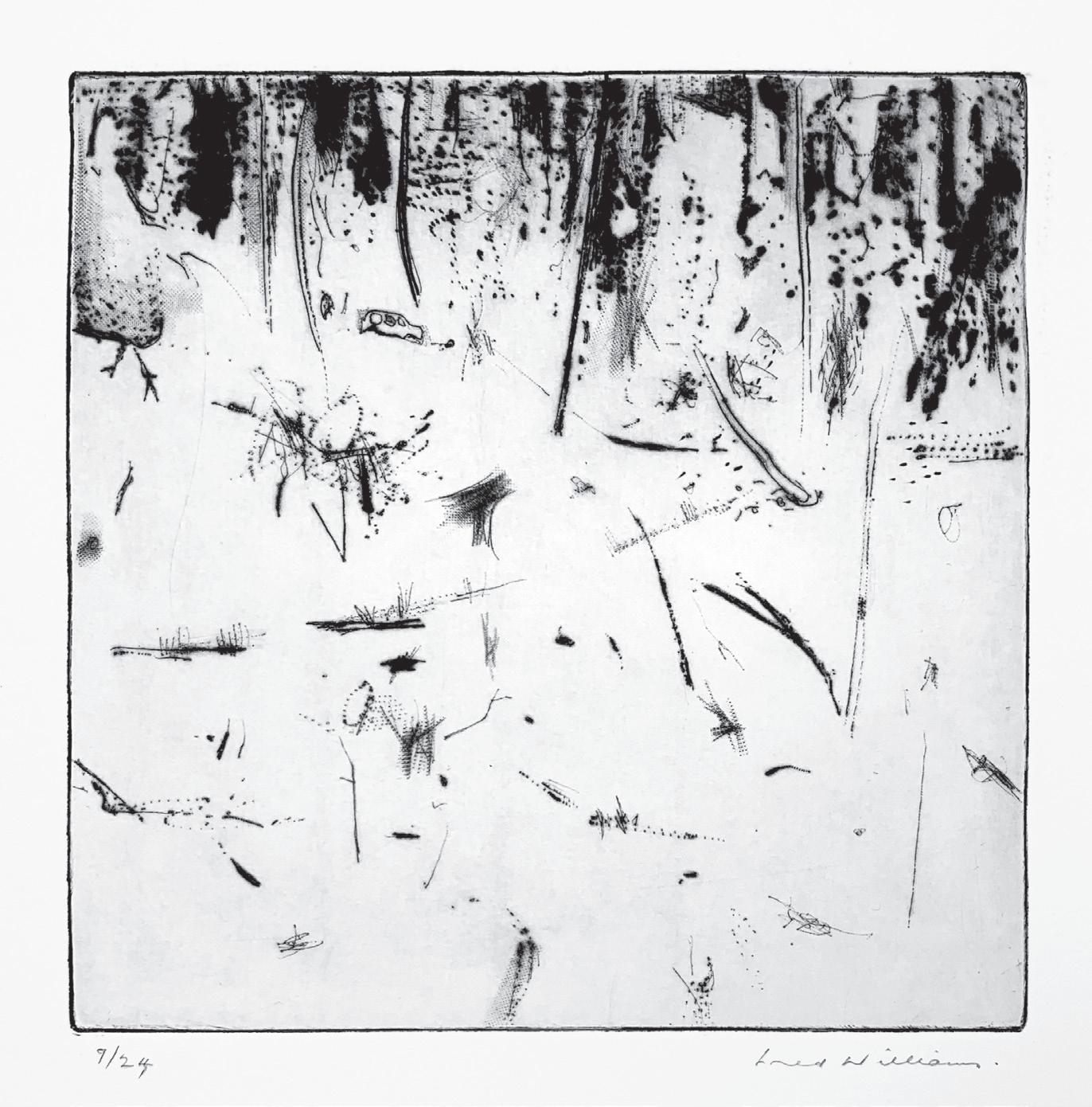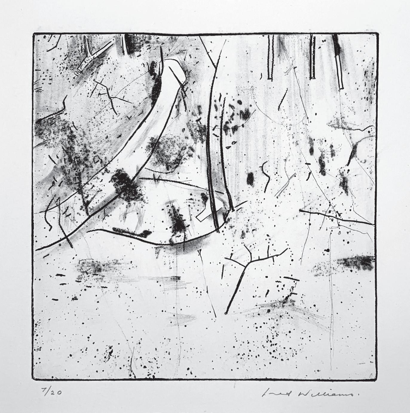patterned tone. This is in contrast to his zones of dark tone, how he used high pressure upon the soft pulp of a thick paper to achieve passages of velvety blackness. At times Williams also subtly worked plate tone, giving a moody tinge to blank space. Even the grooved line left by an etching plate’s edge might be used as a thin crusty framing device, introducing visual closure to a reductive minimalist-like design.