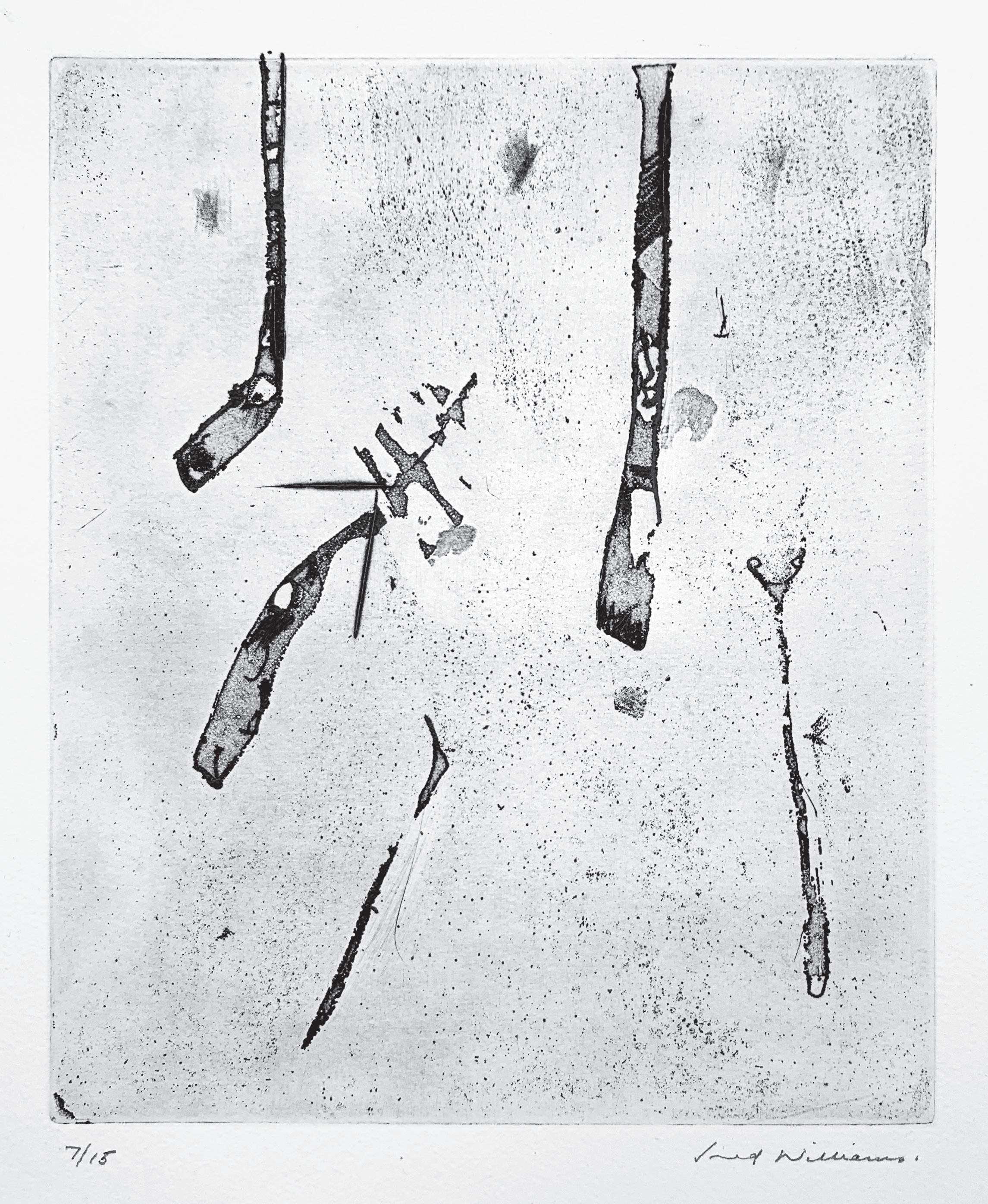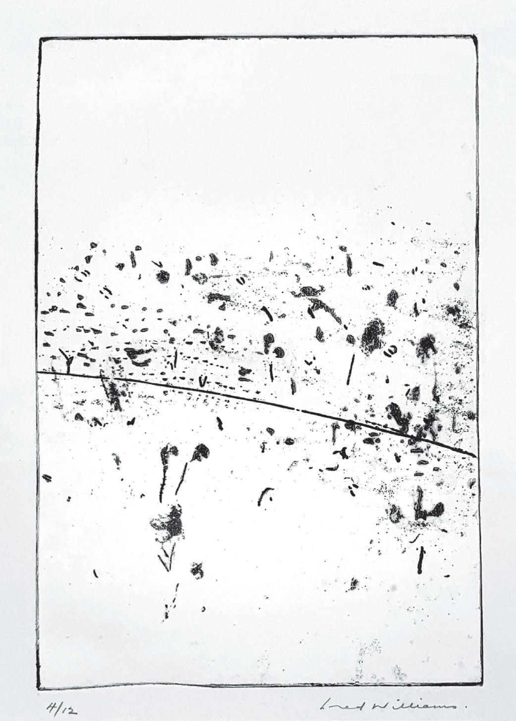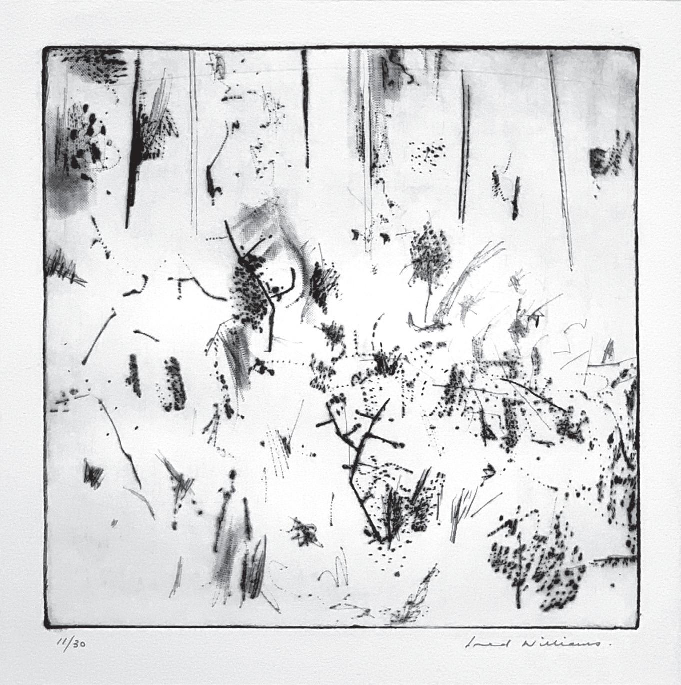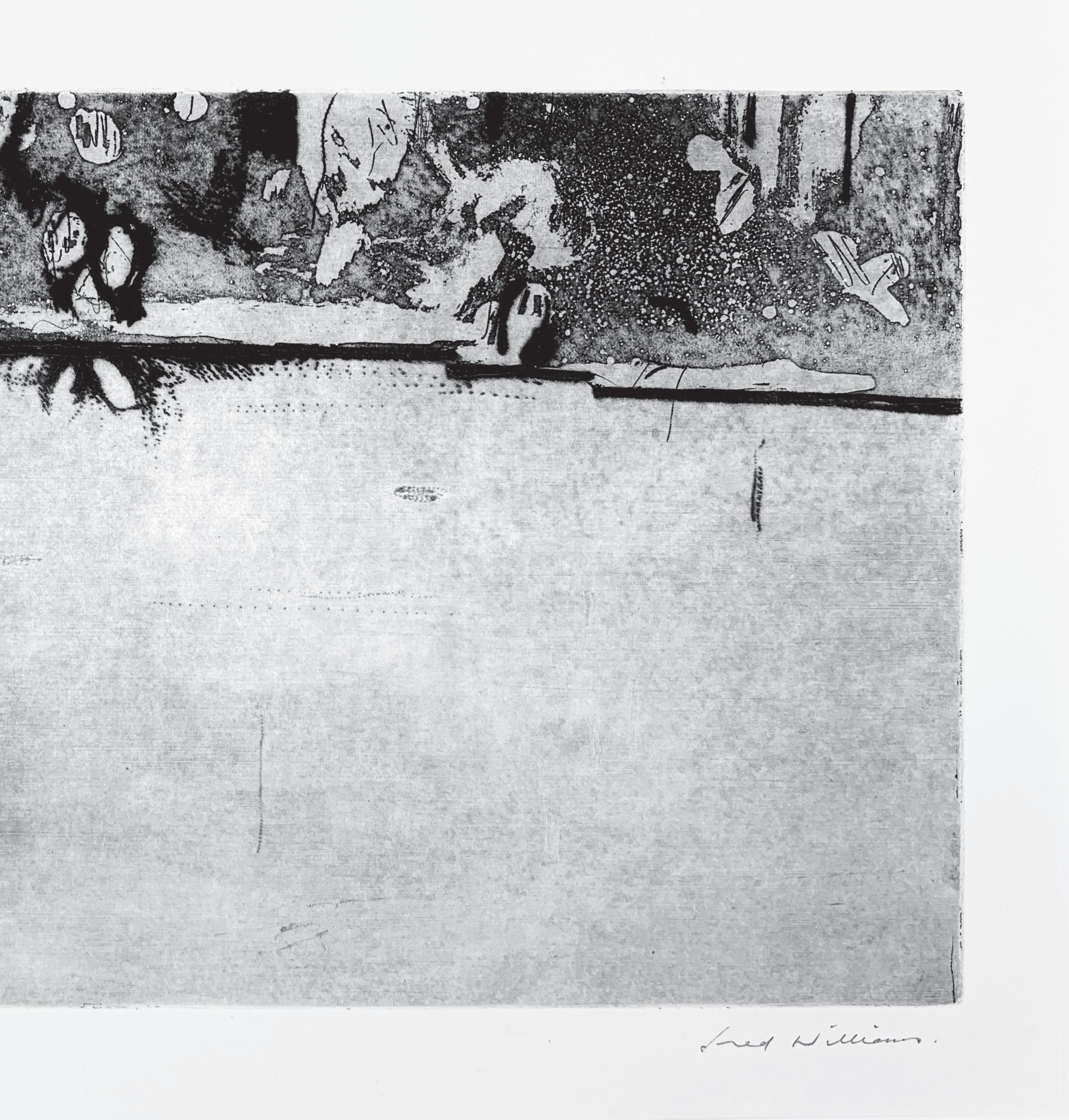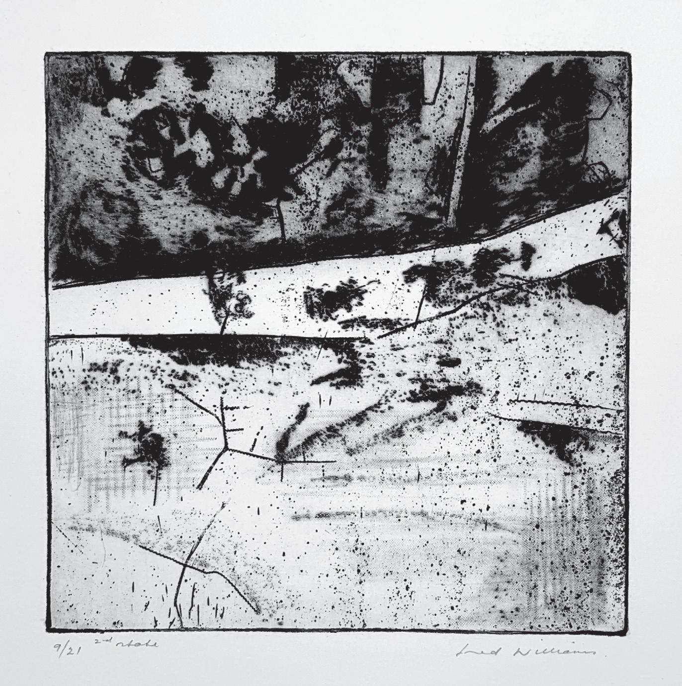 patterned tone. This is in contrast to his zones of dark tone, how he used high pressure upon the soft pulp of a thick paper to achieve passages of velvety blackness. At times Williams also subtly worked plate tone, giving a moody tinge to blank space. Even the grooved line left by an etching plate’s edge might be used as a thin crusty framing device, introducing visual closure to a reductive minimalist-like design.