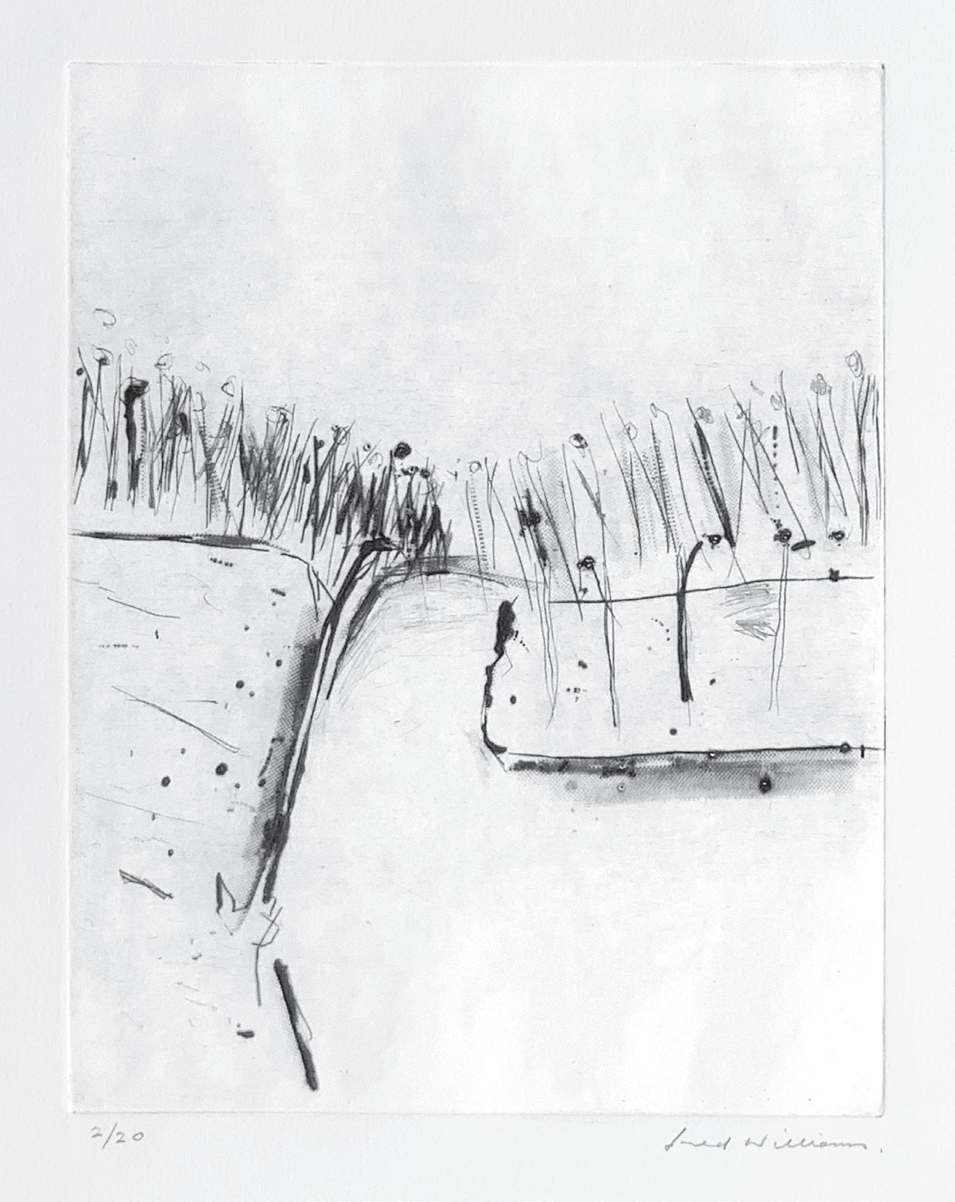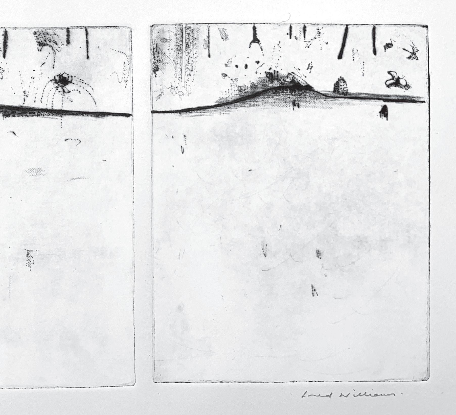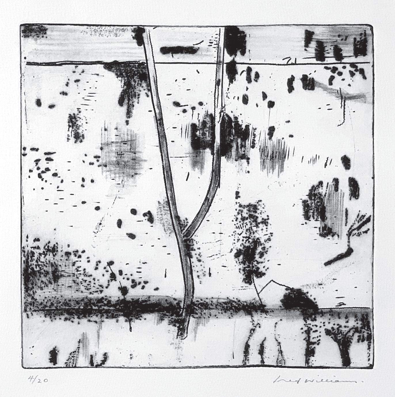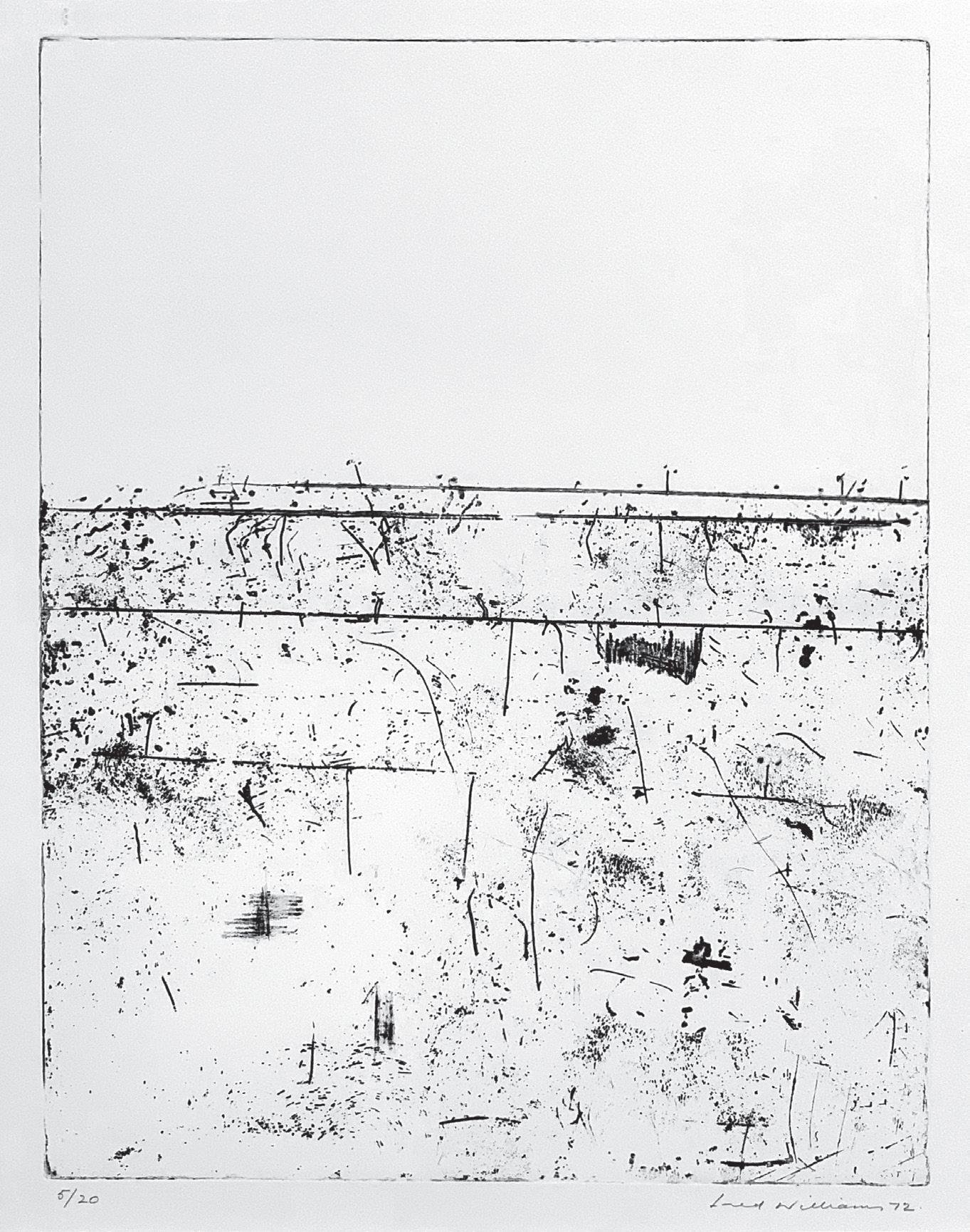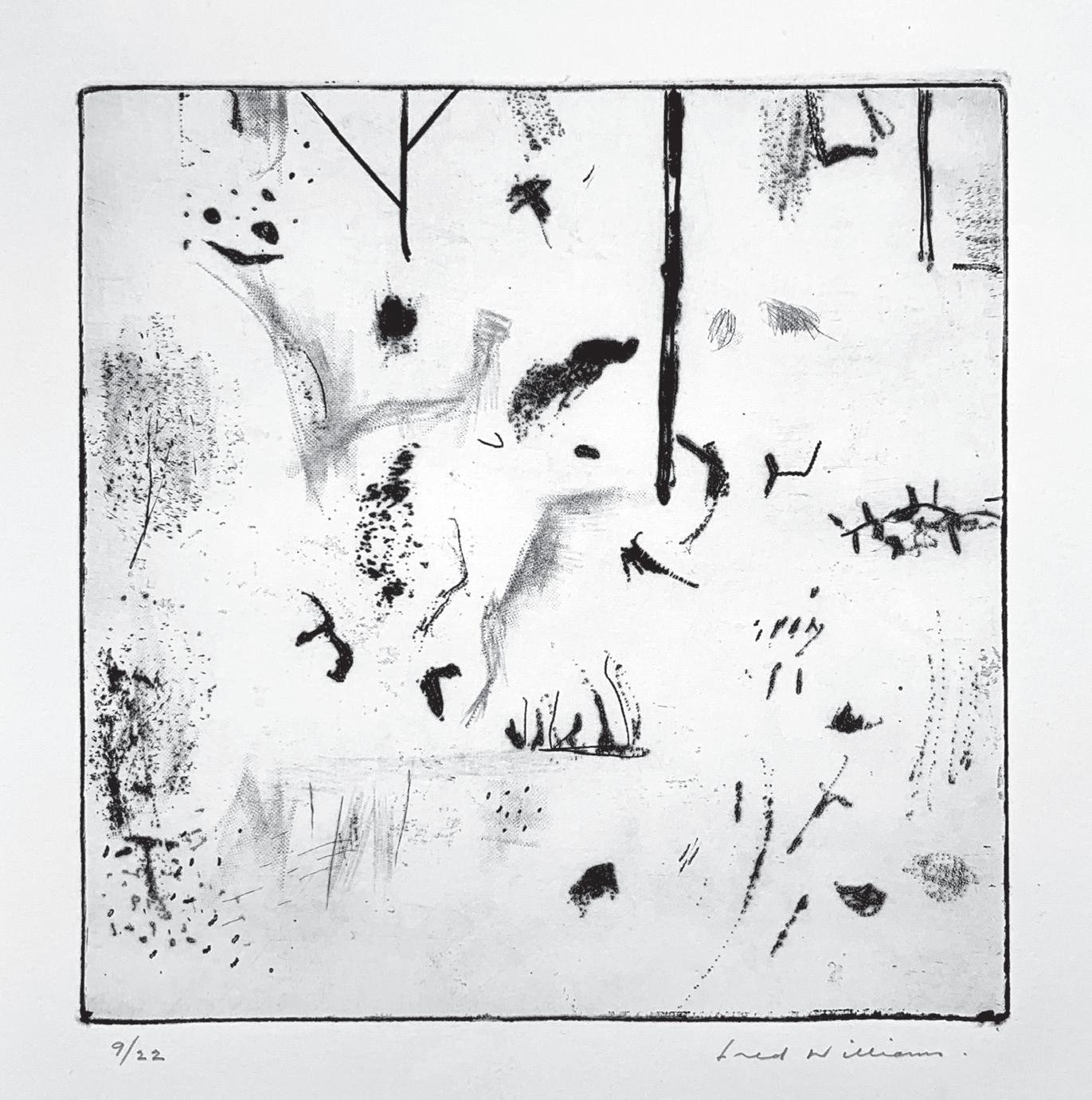 patterned tone. This is in contrast to his zones of dark tone, how he used high pressure upon the soft pulp of a thick paper to achieve passages of velvety blackness. At times Williams also subtly worked plate tone, giving a moody tinge to blank space. Even the grooved line left by an etching plate’s edge might be used as a thin crusty framing device, introducing visual closure to a reductive minimalist-like design.