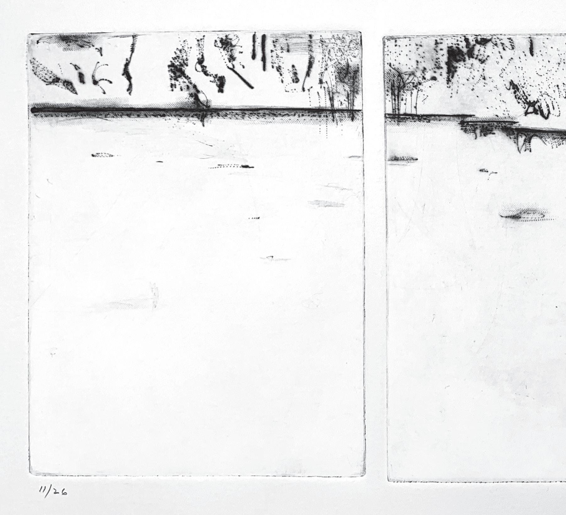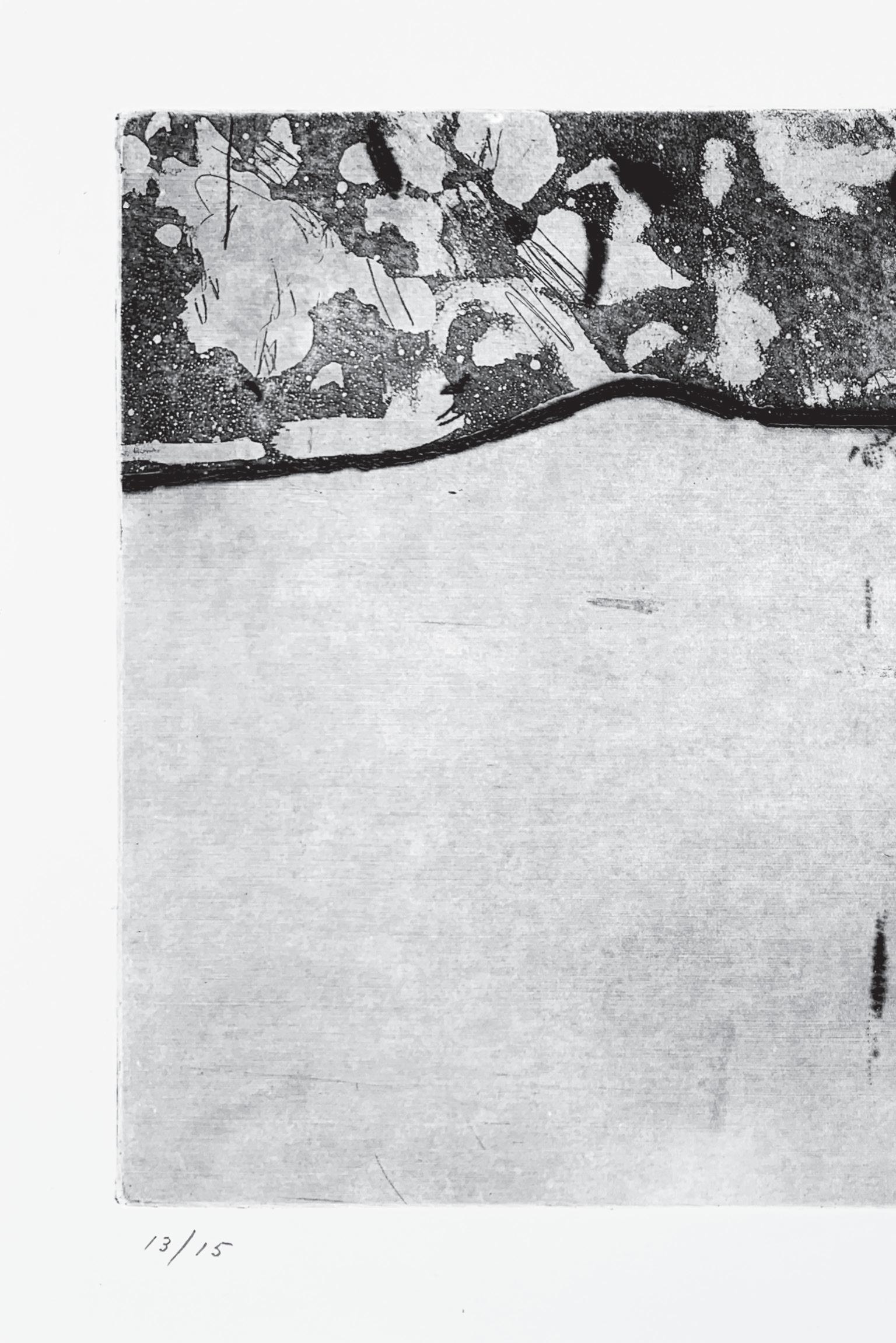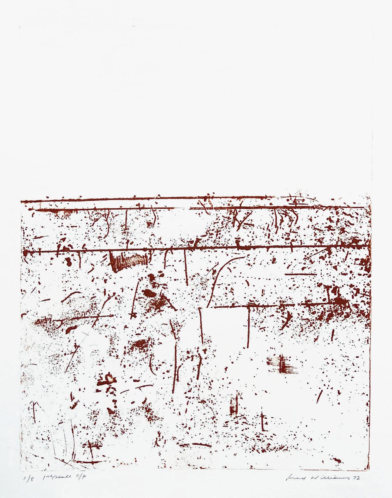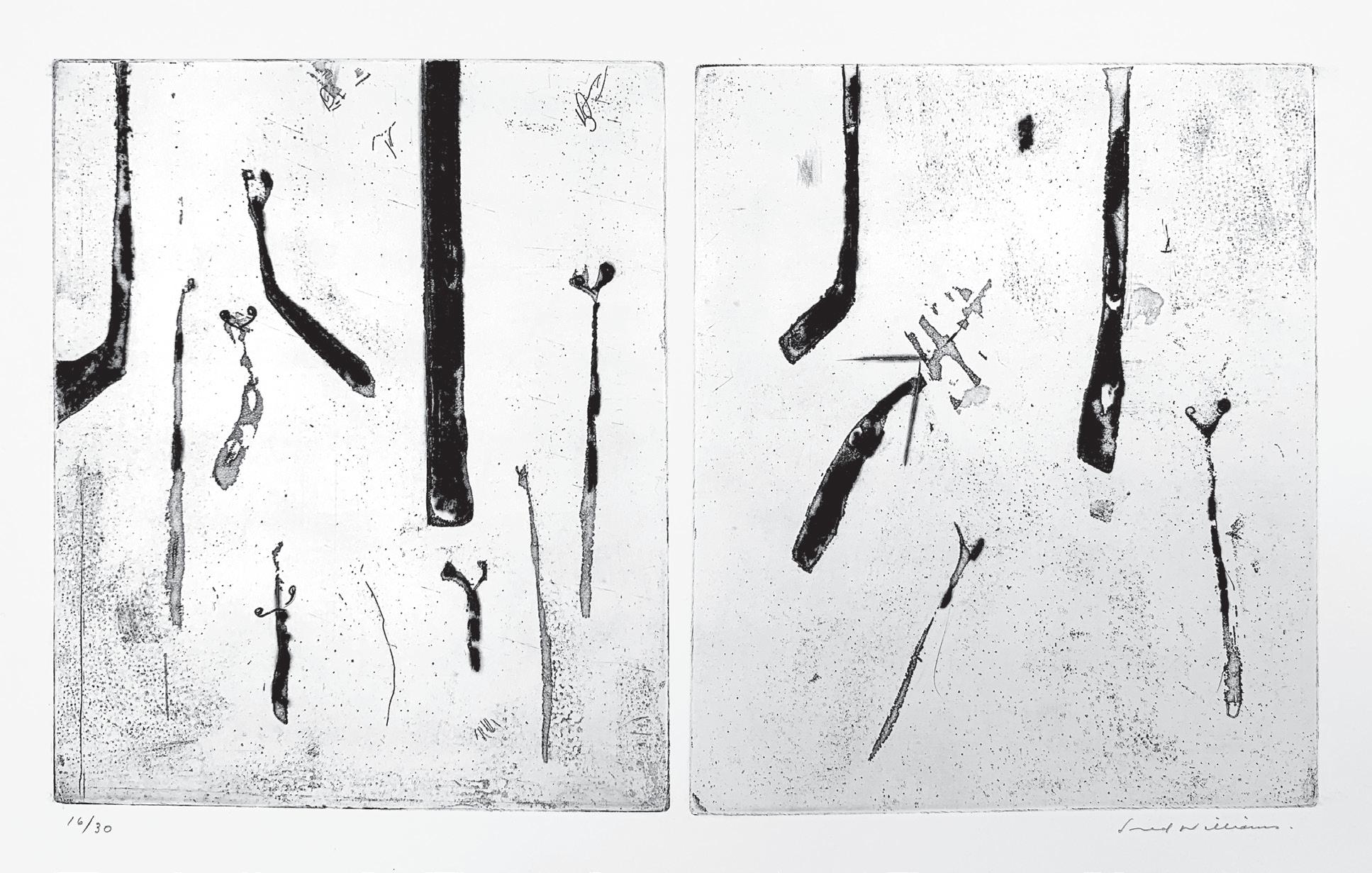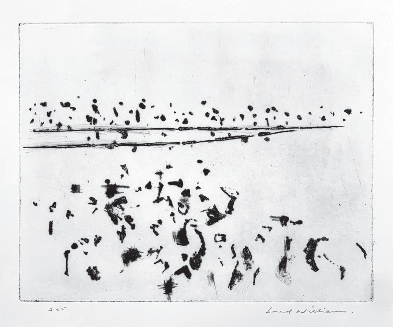 patterned tone. This is in contrast to his zones of dark tone, how he used high pressure upon the soft pulp of a thick paper to achieve passages of velvety blackness. At times Williams also subtly worked plate tone, giving a moody tinge to blank space. Even the grooved line left by an etching plate’s edge might be used as a thin crusty framing device, introducing visual closure to a reductive minimalist-like design.