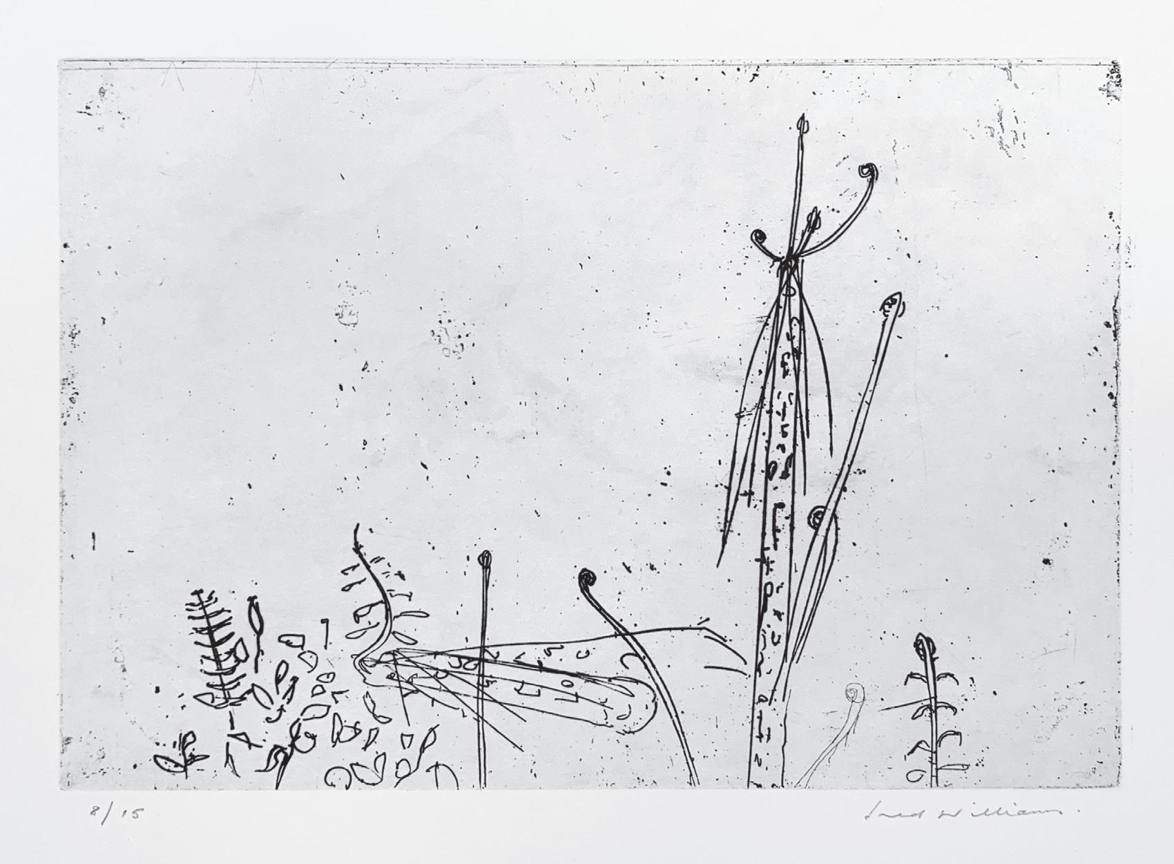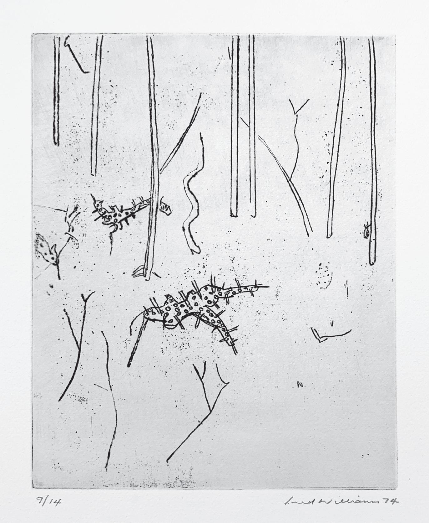 The current selection surveys these authoritative later etchings. In technical terms, Williams had made small etched copies of linear drawings when he took up printmaking in London. His inked lines then were neat and tight, and he kept paper clean and white. But we see in these later etchings the proficiency and amplitude of a skilled master, how the artist crafted each new work much as expert painters handle oil pigment. There is eloquence to the creative decisions seen here. With a range of procedures from drypoint through to foul biting, he attended to the character of his inked lines. They now varied from slight to emphatic, fine to strong. Its not so much that trees and rocks are translated into points, dashes and little smoky blobs. There is a subtle music to this mark making. The very lines sing.