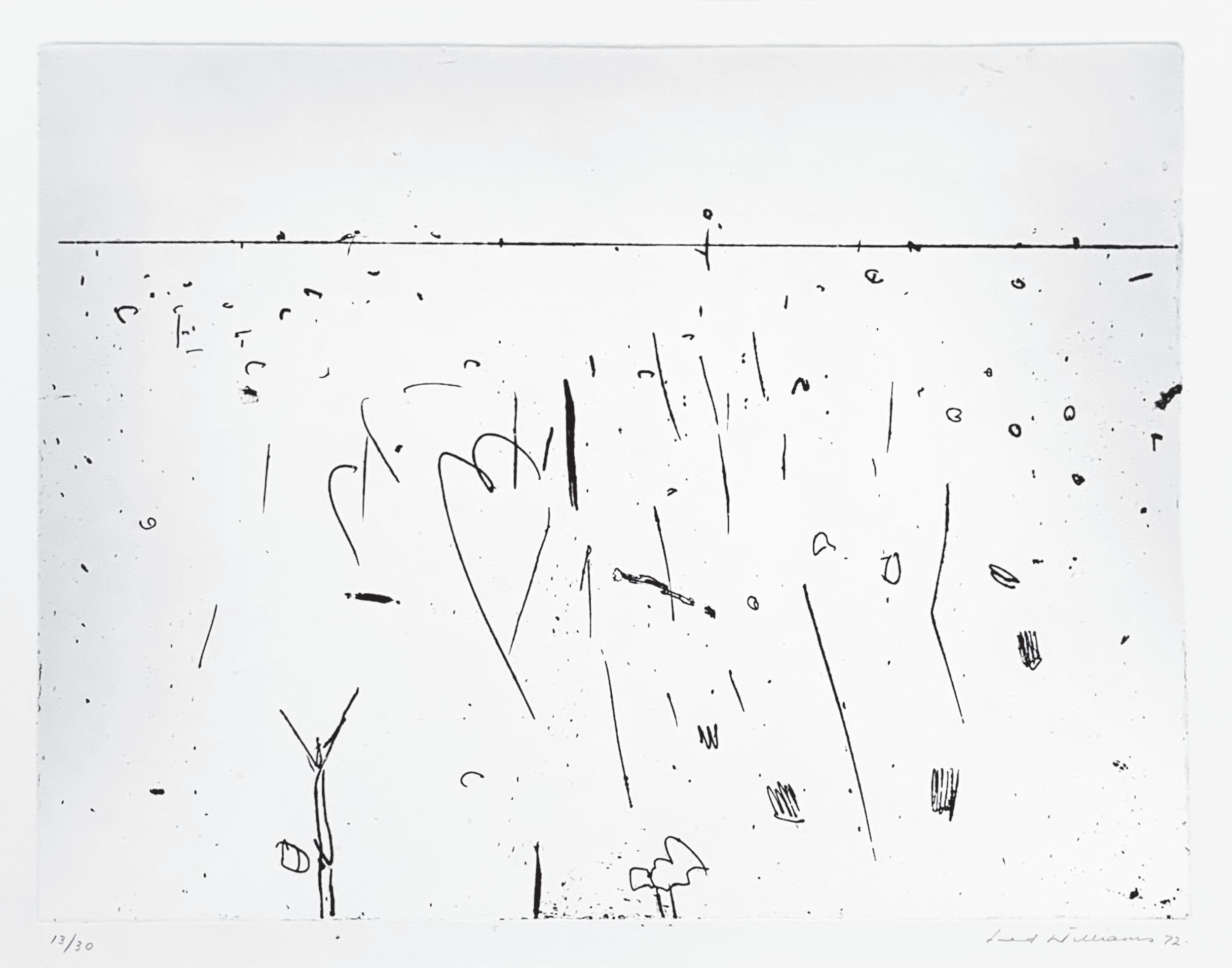 Fred Williams had an aptitude for what is a demanding medium. Finding a fulfilment in the methodical process, he loved crafting an etching. This is probably why—unlike most painters—he did not pass his finished plates over to a technician to run off a full edition. Instead, he preferred to print each individual impression himself. The results are telling. If the paintings are rich, his etchings are positively spicy. Gazing into a Williams print, absorbing it, is such a sensual experience. His handwork is ever present.