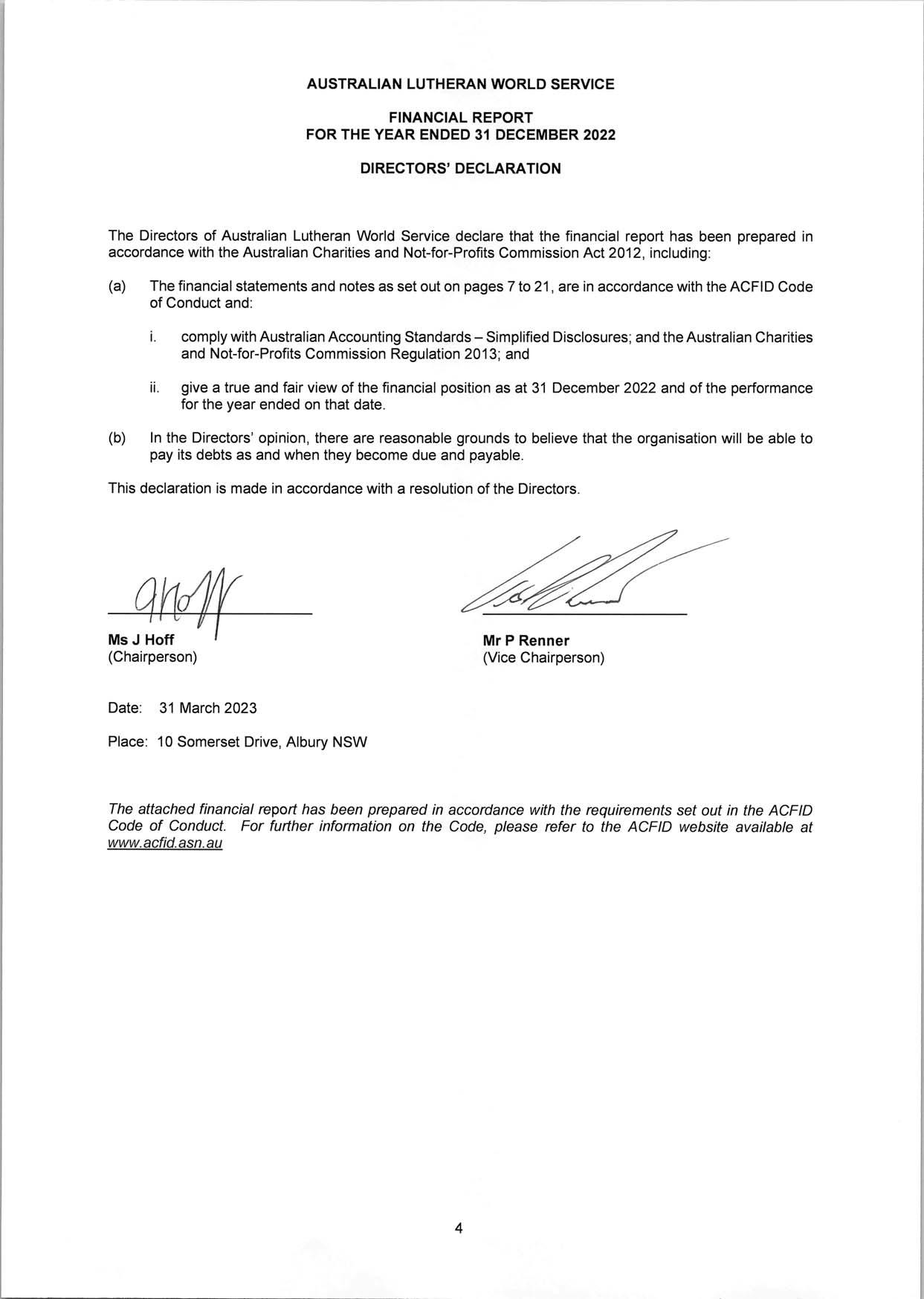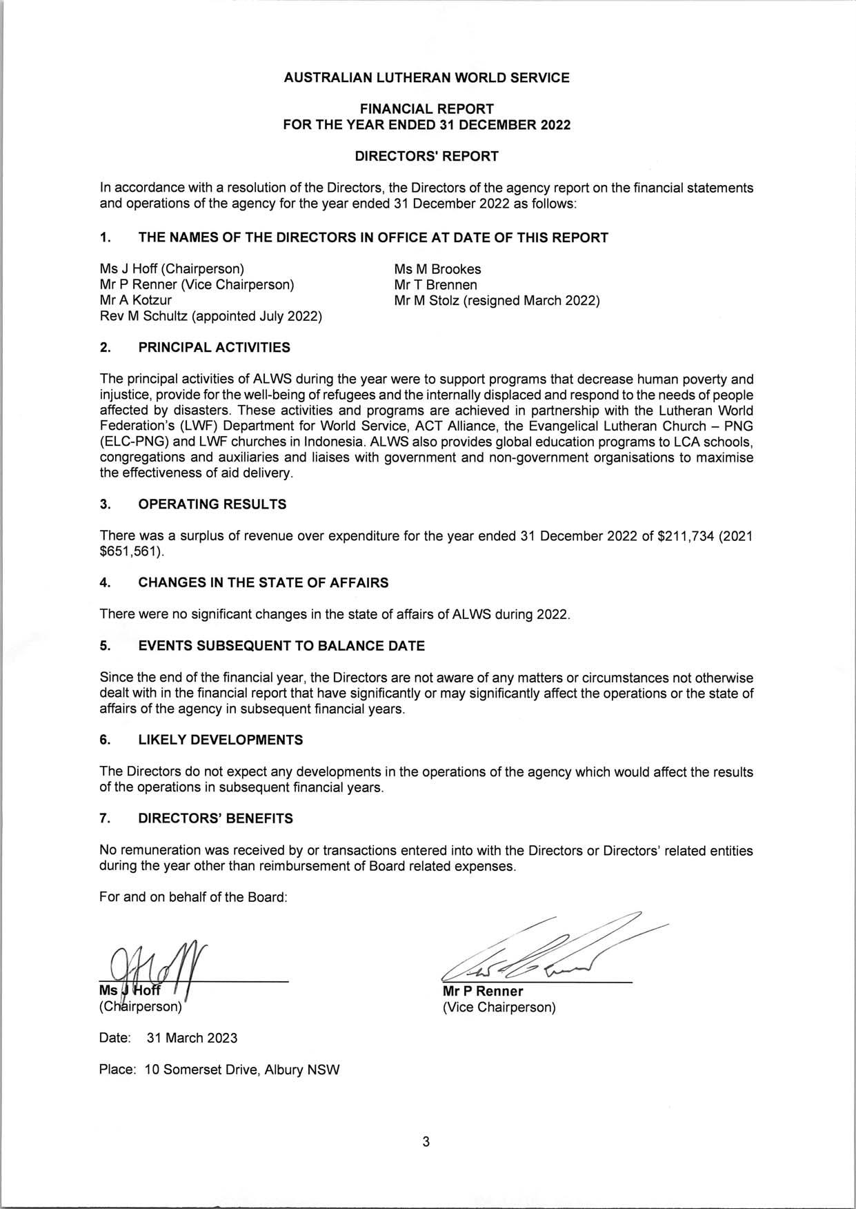 AUSTRALIAN LUTHERAN WORLD SERVICE FINANCIAL REPORT FOR THE YEAR ENDED 31 DECEMBER 2022