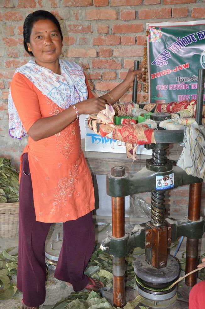 The group collects the leaves from the Sal trees in their community, hand-stitch the leaves together, and use a special machine to press it into a plate.