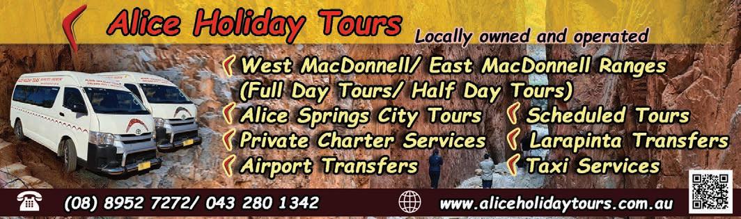 and knowledgeable guides as you discover the region’s unique history, culture and natural beauty. One of their most popular tours is their Alice Springs to Ulu r u Day Tour for those looking to experience the spiritual heart of Australia in a single day. Alice Holiday Tours also offer private charters, airport transfers, taxi services and affordable transfers to the famous Larapinta Trail. Whether it’s a half-day adventure or a full-day expedition, their offerings make exploring the Red Centre easy, engaging, and unforgettable, leaving you with a deeper appreciation of Central Australia.