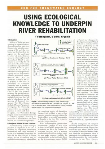 USING ECOLOGICAL KNOWLEDGE TO UNDERPIN RIVER REHABILITATION P Cottingham, S Bunn, G Quinn Introduction of Vannote and co ll eagues, the 0 In- strea m producti on flo od- pu lse co ncept (FPC) of M ill ions of do llars are spent • T errestrial ca rb on -0 River carb on J unk an d co-wo rkers, and th e each year on trying to improve ri veri ne produ ctivity m odel th e condition of our waterv-1ays. (R PM) of T horp & D elo n g. However , the scientific u nde rEach m odel places a differe nt pin ni ng of chis work has been emphasis o n aspects such as the li mited and there have been few sources Down stream tra nspo rt of ca rb o n Im portant o f carbon that drive reports on t h e eco lo g ica l prod ucti vity and th e role of R ipa rian Inputs Impo rta nt b e n e fit s of rehabi l it at io n flo ods (Figure 1) . Th e R CC measures when implem ented. (a) River Continuum Concept (RCC) places em phasis on terrestrial This makes it di fficult to learn carbon and nutrients that enter and pass on know ledge that w ill w ate r w ays as a res u l t o f assist others who are also trying Emphasis 11 on lower fl o od -plain procesao u pstream processes. T he other Upper catchm ent likel y to be sa me as RCC to rehabilitate degraded systems two mod els differ from th e or protec t ri ve rs in go od R CC in their view of th e con dition . It also makes it drive rs o f ecological processes d ifficult to develop a predictive in the lo wland reac hes ofla rge capacity that ca n help us make rivers. Fo r exa mpl e, the FP C in fo rmed decisions on rehabilemp hasises th e importan ce of i t a ti on . T h e C R C fo r (b) Flood- Pulse Concept (FPC) l a t e ra l r iver- fl oo dp la in Freshwa ter Ecology (CR C FE) exchanges fo r large ri ve rs and is p lay in g a v ital rol e in proposes chat riverin e fo od providing t h e eco l o g ica l Emph 11l1 11 on local proce11es webs are more depend ent o n knowledge that is needed to Upper ca tc hment like ly t o be same u RCC productio n deri ved fro m th e u nderpin and gu ide practi cal floodplain than o n organ ic r es to ra tio n m easu re s. Th e m atter transported fro m tribuCRC FE h as tw o r es ear ch taries upstrea m. T h e RPM programs th at aim to improve highlights th e impo rtance o f our understandi ng of esse ntial lo cal in-stream production to ecologica l processes that will (c) Riverine Productivity Model (RPM) lowland rivers (phytoplankton, assist in rehabili tation and the b e n thic algae , and ot h e r recove ry o f disturb ed rive r Figure 1. Contemporary models of large river ecology. aquati c plants) and , to a lesser sys tem s. T he ' Flow- Related Reprinted from Moreton Bay and Catchment (I.R. Tibbetts, N.J. Hall extent, direct inputs of organic Ecological Processes' program is & W.D. Dennison, eds, 1998). Marine Botany Group, Centre for matter from the adj ace nt investigati ng the relati o nship Marine Studies, The University of Queensland. riparian zone . T h is model between flo w and ecolo gical suggests that the o th er two processes in rivers and their the u nderl ying so urces of degradation models o flarge river ecosystems underesflo odplains. The 'R estoratio n Ecology' (stresso rs) and are likely to succeed. For timate the role of in-stream production and program focuses on constraints to recovety example, reintroducing wood as habitat for over-emphasise the relative importance o f o f d istu rbed sys te m s, incl u din g th e fish is unl ikely to su cceed if wa ter quality terres tri al organi c m atter from bo th protection or reintroduction of habitat is degraded or th e river dries up du e to headwater streams (R C C) and floodplai ns featu res, and recolo nisation p rocesses . excessive water extractio n. (FPC) . River ecologists o ften co nsider three Conceptual Models of River Function CR C FE investigatio ns of ecological co n temp o rary models of large ri ve r fun ction ing at th ree sites alo ng the River An understanding o f basic ecological processes is imp ortant if we are to ecology, each o f which assu mes that ri ver Murray (the Lowland Rivers Project, with p rio ritise and im plem ent rehabilitatio n ecosystems are driven by ' b ottom up ' sites located near Albury, Barm ah fo rest m easures that have a high likelihood of processes (processes su ch as primary and n ear H attah- Kulkyne N ational Park) success. If we understand river ecology and productivity and n utrient cycling, which have found that phyto plankton played a how this has been affected by human in turn make resources available fo r major role in river productivity at each site. activity we can be co nfident that any organisms higher up the foo d chain). These Bacterial commu nities also contributed to rehabilitation measures we adopt address are the river co ntinuum co ncept (R CC) p ro d uc tiv ity in th e Ri ve r Murra y, WATER DEC EMBER 2002
