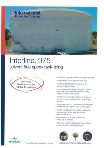Interline®975 solvent free epoxy tank lining • Solvent free, high build, amine cured epoxy tank lining • This product is approved to AS/NZS 4020 • Certified to BS6920:2000 standard for the storage of drinking water • Hard, glossy coating which provides a long-life, easy clean, low maintenance surface for safe, taint-free potable water storage • Can be used to provide resistance to a range of products including potable water crude oil, and white oils • 100% solids, zero voe formulation which eliminates solvent emission, explosion risk and fire hazard • Suitable for application as a single coat system, using standard airless spray equipment, economical to apply • Recoatable up to 28 days for improved scheduling of contracts • Part of the Ecotech Initiative to promote the use of environmentally sensitive products