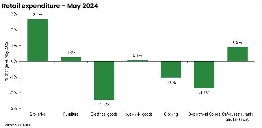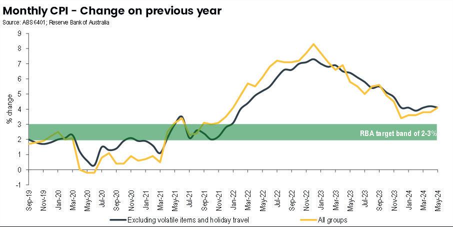 There was a fair bit of surprise with the latest monthly infation fgures, which increased to 4.1% in the year to May 2024. The RBA wants to get this back to its target of 2-3% as soon as possible, otherwise risking accelerating prices becoming fxed within people’s expectations. Keeping interest rates higher for longer is certainly a ‘less bad’ outcome for the economy than if infation was to re-accelerate.