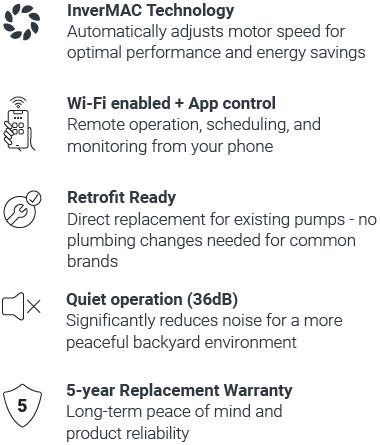 Madimack’s Inverflow PLUS redefines reliability and innovation in pool pump technology. Backed by an industry-first 5-year warranty, this variable speed inverter pump delivers outstanding energy efficiency, whisper-quiet operation and smart features for years of hassle-free performance. Enjoy skimmer mode, WiFi remote control and a compact, space-saving design. Retrofit-ready for most major brands, the inverFLOW Plus seamlessly retrofits to existing plumbing, no extra pipework required.