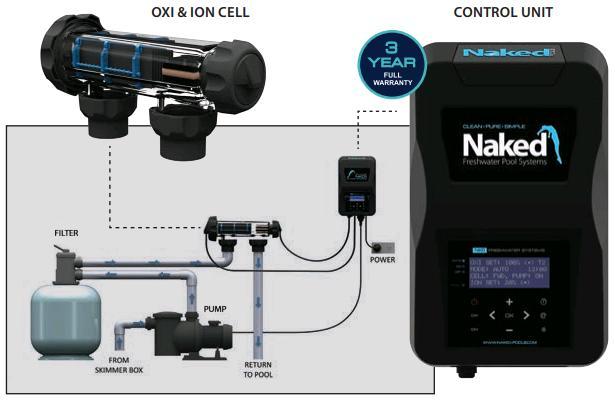The hybrid Naked System is made up of a digital control unit which supplies and manages current to the electrode assembly (OXI & ION Cell). Electrolysis passes through the copper and silver anodes, releasing the ions into the water. The silver disinfects the water controlling bacteria and the copper prevents algae growth. The minerals left in the water form a residual that continues to sanitise the water.
