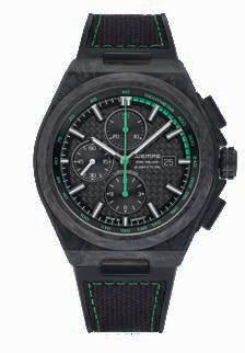 Maskulin, funktional und auf nur 75 Stück limitiert monieren auf dem mattschwarz gemusterten Zifferblatt perfekt. Kontraststarke Highlights in Grün und mit Super-LumiNova® beschichtete Zeiger und Stahlindizes halten den Chronographen bei allen Lichtverhältnissen einsatzfähig. Dank des verschraubten Gehäusebodens bis zu 100 Meter wasserdicht. Angetrieben durch das hochpräzise Automatikwerk Kaliber SW 500.