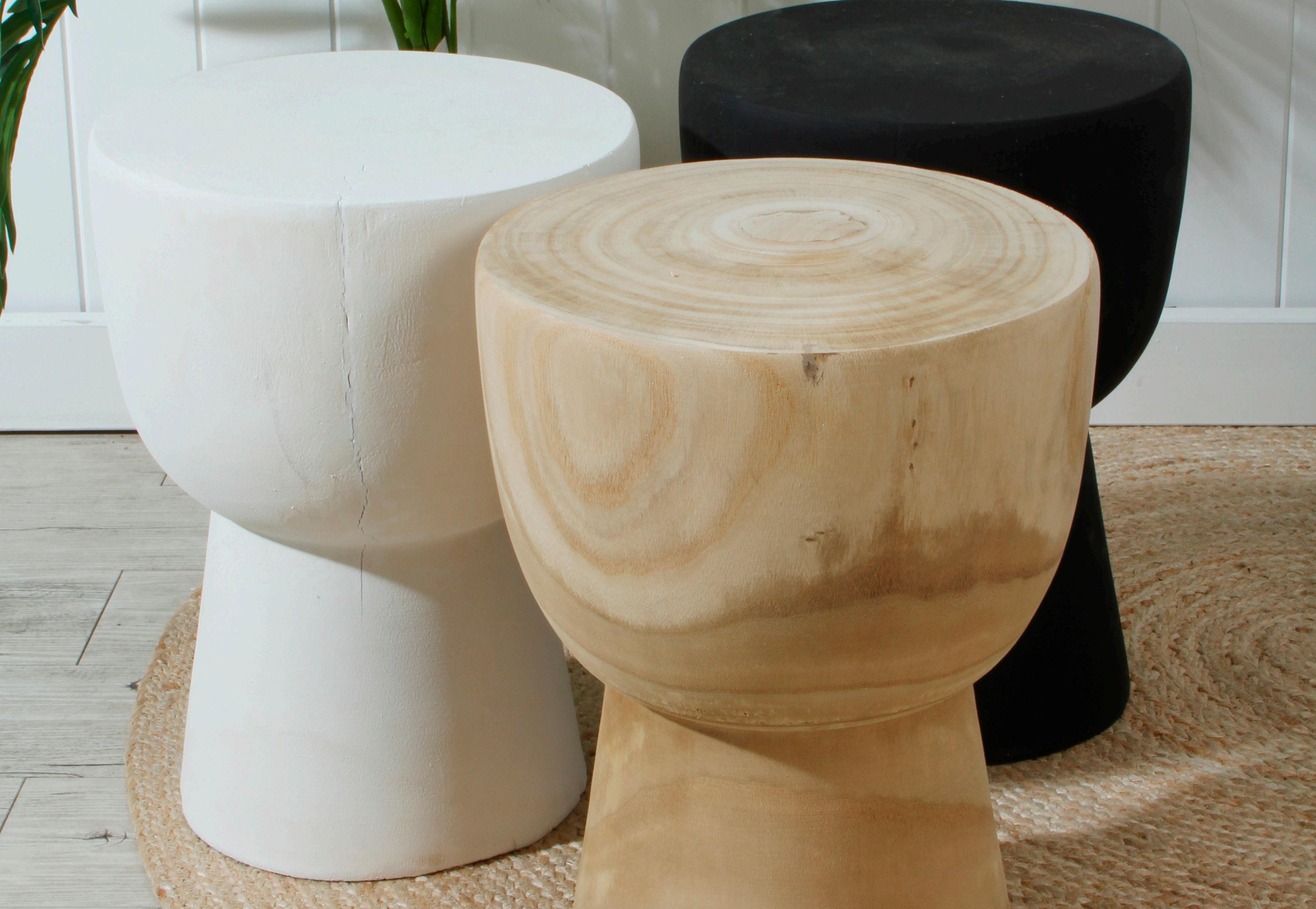 NEW shapes in our Best-Selling Timber Stool Range! Available in 3 colours! Get them whilst you can!This range is so popular for its complete versatility. Stools, side table, display table, bedside, plant stand, or add an alfresco.