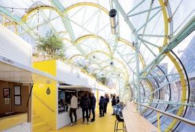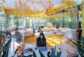 spiegelnde Trennwände sowie hunderte von Pflanzen, die zudem das Raumklima verbessern und schallabsorbierend wirken. In Lissabon entstand unter dem gusseisernen Dachstuhl der historischen Markthalle ein Indoor-Dschungel aus organisch geformten Schreibtischen und über 1.000 Pflanzen. In Hollywood wiederum schufen sie inmitten der Stadt eine grüne Insel, wo 1.200 Arbeitsplätze sowohl in einem neoklassizistischen Bestandsgebäude, als auch in 60 unterschiedlich großen, rundum verglasten Pavillons in einem tropischen Garten untergebracht wurden.