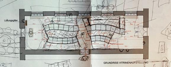 Zwei lange, schlangenförmige, 1,20 m breite und 3 m hohe „Vitrinengebäude“, grob parallel in den Raum gestellt, lassen eine Mittelgasse und zwei Wege an den freien Raumseiten für die Besucher*innen entstehen. Konstruiert oder eher „gebastelt“ sind die Vitrinen in grob quadratischen Feldern aus verschieden starken, mit Glashalteleisten zusammengesetzten Fichtenstehern, die teilweise über das Volumen hinausragen und so keine strenge Oberkante entstehen lassen. Die Decken der Vitrinen bestehen aus schwarzen Platten, auf die längsgerichtet, ganz unkonstruktiv, scheinbar kreuz und quer verschieden lange Bretter montiert wurden, wodurch der Vitrinenraum auch oben fast „schlampig“ wirkt und mit Punktleuchten zwischen den Brettern abschließt. Das war die erste Phase der Ausstellungsgestaltung, die man heute nur mehr erahnen und anhand von Planskizzen nachvollziehen kann. Es war vielleicht auch jene Lösung, die man aufgrund der Kenntnis des Werks von Kawamata gut nachvollziehen kann – eben zwei zusammengezimmerte „Kawamata-Latten-Vitrinen-Schlangen“ in einem Raum, bestückt mit den dazu gegensätzlichen geometrischen, rundlichen Tongefäßen.
