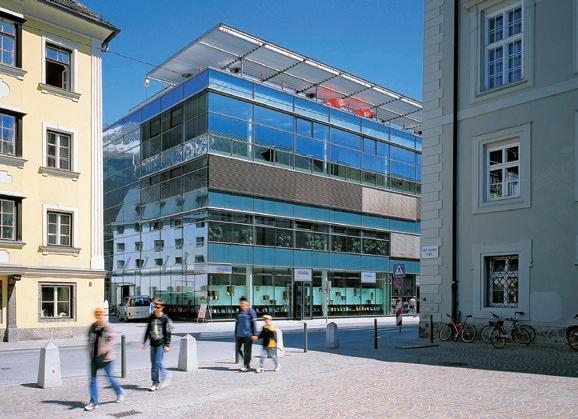 ein neues stück schwaz – das raiffeisenquartier Was eine Schutzzone bewirken kann – und bei der Tabakfabrik bewirken hätte können – zeigt sich im jüngsten Viertel der Stadt Schwaz, dem Quartier am Raiffeisenplatz. Die Lage des 0,5 ha großen Grundstückes in der Schutzzone bedingte einen städtebaulichen Wettbewerb – ein zentrales Mittel zur Qualitätssicherung eines Stadtbildes nach dem sog – den die Architektin Silvia Boday gewann. Ausgehend von der denkmalgeschützten alten Post (heute: Raiffeisenbank) strickt ihr Konzept die Stadt sensibel und zeitgemäß in den nach Süden leicht ansteigenden Stadtraum fort. Die neuen Baukörper nehmen Straßenfluchten auf, ergänzen bestehende Gebäude und führen neue Gassen ein, die das vorhandene Wegenetz der Stadt bereichern.9 Die Gestaltung der Fassaden und der Details greift vorhandene historische Elemente von Schwaz auf und interpretiert sie neu.10 Eine Kritik sei jedoch angebracht: Ein zeitgemäßer Städtebau darf in Zukunft nicht ohne Erhöhung des Baumbestandes umgesetzt werden, d. h. der Wunsch nach Stellplätzen darf nicht höher bewertet werden als die notwendige Ökologisierung der Stadt.11