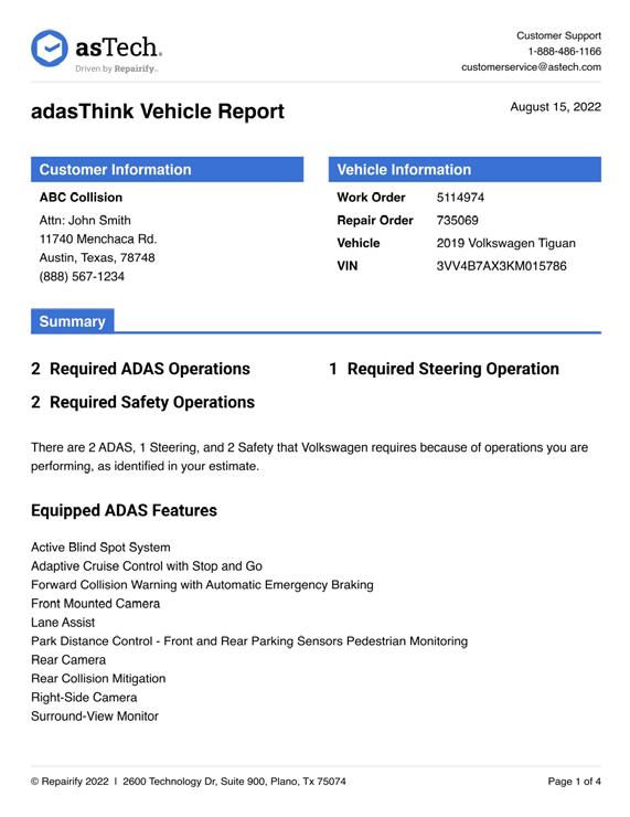 We’re able to do all of this digitally, and users can document anything that is potentially wrong with the vehicle in a digital report. That’s where an adasThink report comes in — it takes an estimate and lists any ADAS components that were affected during the vehicle crash and what is required from a safety ADAS calibration perspective.