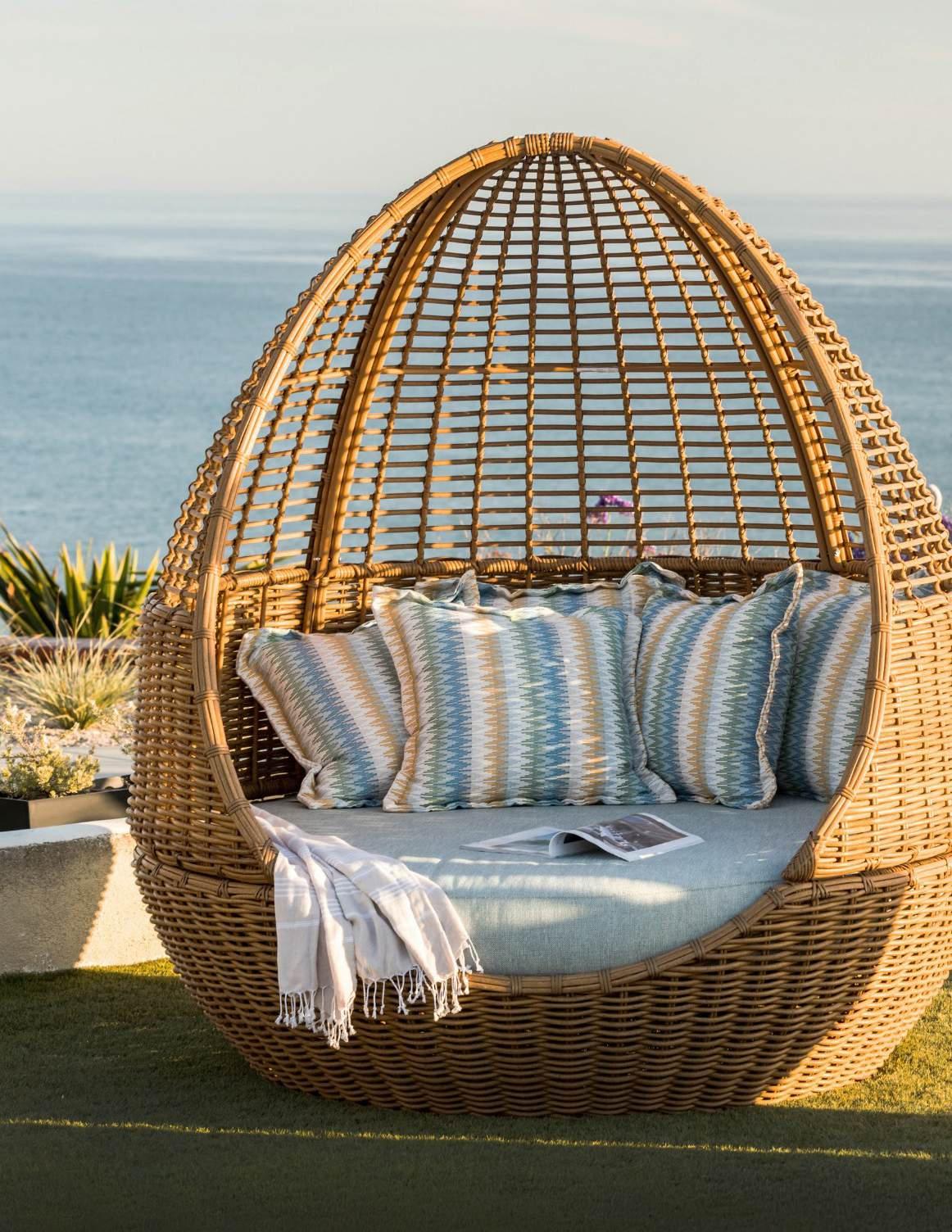 Plush weather-resistant upholstery resists fading and stains, while woven details add a touch of coastal charm.