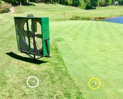 Dear John: I hit a great drive (for me) on the par-5 13th hole, which plays 435 yards from the white tees. I was about 185 yards from the green - in the “Go Zone” (see image)! I don’t get many chances to make the green of a par-5 in two shots, so I decided to go for it, even with a boat anchored close to the green. I hit my hybrid as well as I can hit it, straight at the flagstick. The shot cleared the cove, landed on the putting green, and rolled into the rough... right behind the greenside fan! No good shot will go unpunished! I was totally blocked from chipping to the hole. What’s a guy to do?