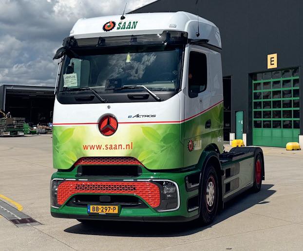 Deze Saan vrachtwagen is groener van kleur dan de rest. eACTROS