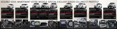 *Votre bénéfice Sergio Cellano: sièges sport élégants, volant cuir, pommeau gainé cuir, aileron arrière, jantes alu 16 , antibrouillards, vitres teintées, tempomat, lève-vitres électriques et pack Sergio Cellano avec bandes décoratives, porte-clés et tapis d’une valeur totale de Fr. 5 310.–, baisse de prix Fr. 2 000.–**, bénéfice client de Fr. 7 310.–