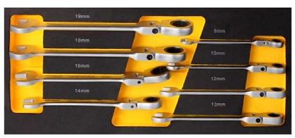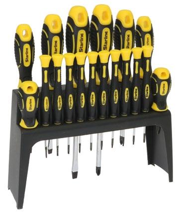EXCENTRICKÁ BRUSKA 350 W (GV HL-RS010) volnoběžné otáčky 0–13 000 ot./min. • brusný talíř 125 mm AKU ÚHLOVÁ BRUSKA 18 V / 4 AH (GV HL-AG07N) • kompatibilní akumulátor s AKU nářadím Starline 18 V kapacita baterie 4,0 Ah/Li-ion 18 V • otáčky naprázdno 8 000 ot./min. průměr upínacího kotouče: 115 SUPER CENA INOVOVANÝ MODEL INOVOVANÝ MODEL OČKOPLOCHÉ RÁČNOVÉ KLÍČE S KLOUBEM – 8 ks (NR F1.ET78) • rozměry: 8 × 9, 10 × 11, 12 × 13, 14 × 15, 16 × 17, 18 × 19 mm • uloženo v pěnovém modulu • kloubová hlava s ozubeným ráčnovým mechanizmem SADA ŠROUBOVÁKŮ – 18 ks (GV HL-18) • obsahuje ploché, křížové a minišroubováky NÁŘADÍ