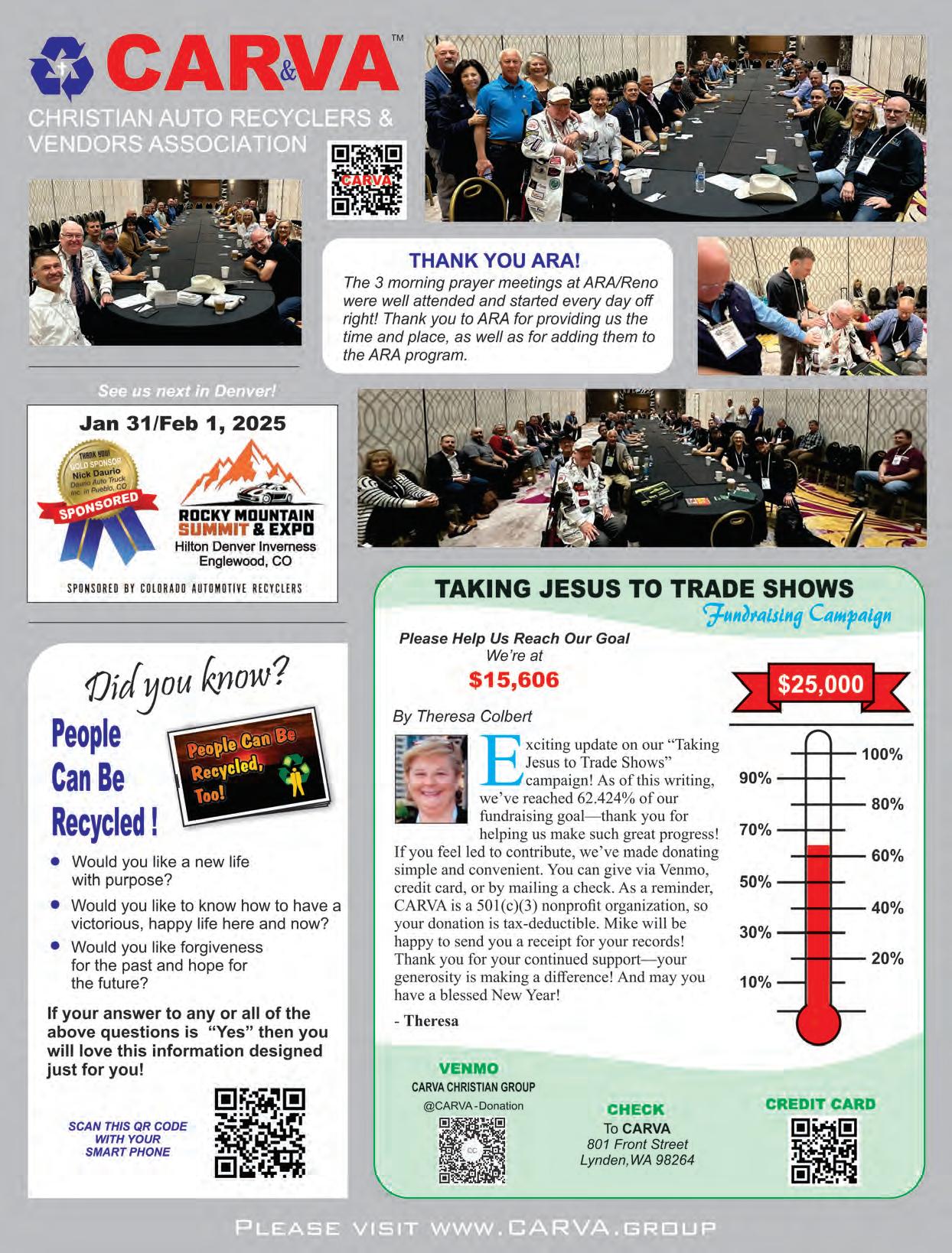 Mike French is retired after 39 years of business in the automotive recycling industry. He is an author, publisher, consultant, and speaker. Mike is the founder and executive director of the Christian Auto Recyclers and Vendors Association (CARVA) and will be at upcoming recycler trade shows and events. Mike is available to speak at your group, conference, or event. He loves to share inspirational stories that demonstrate how the Word of God actively changes lives. He can be reached at mike@carva.group. Visit www.CARVA.group and/or www.PowerPackedPromises.com.