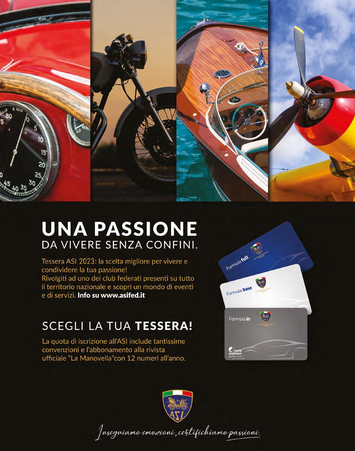 bito ASI. Nel 2021, ad esempio, sono stati celebrati i 60 anni della rivista La Manovella, organo ufficiale dell’Automotoclub Storico Italiano e strumento di divulgazione della cultura motoristica. Inoltre, per rimanere nel settore editoriale, vale la pena rimarcare lo straordinario successo del romanzo “Il giovane Giorgetto” pubblicato dalla casa editrice di ASI. Senza contare che l’emergenza sanitaria e le relative costrizioni vissute all’inizio dello scorso anno hanno portato all’uso sempre più intenso dei social network, grazie ai quali è stato possibile realizzare e diffondere il nuovo format “Cultura Live”: dirette streaming settimanali con ospiti di grande livello che in ogni puntata hanno regalato perle di cultura e passione. Nello stesso tempo, l’Automotoclub Storico Italiano ha potuto riaffermarsi come riferimento per l’intero settore raggiungendo obiettivi importanti in ambito normativo e legislativo. Oggi più che mai, infatti, la tutela dei veicoli storici inizia con una regolamentazione nazionale sempre più chiara ed equa. ASI, di concerto con gli altri Enti certificatori e con gli organismi istitu-
