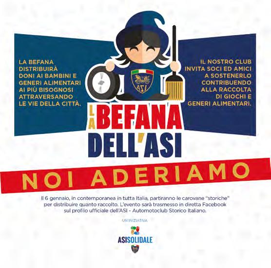 ASI Solidale – il settore che coordina le attività sociali dell’Automotoclub Storico Italiano - ha sensibilizzato i Club Federati e i tesserati di tutta Italia affinché la “Befana dell’ASI” fosse più generosa che mai. Nelle scorse settimane gli appassionati hanno consegnato le proprie donazioni presso il rispettivo Club di appartenenza il quale, giovedì 6 gennaio, provvederà alla distribuzione presso le strutture e gli enti di assistenza individuati sul territorio. Il tutto sarà seguito in diretta streaming sui canali web e social dell’Automotoclub Storico Italiano, in modo da condividere la gioia di donare. Tra le collaborazioni instaurate da ASI Solidale a livello nazionale per questa speciale Befana 2022, si segnala quella con l’Associazione Teniamoci per mano Onlus, che dal 2010 si prende cura dei bambini, delle famiglie e degli anziani sofferenti con gli effetti benefici della clownterapia: la fantasia, le risate e le emozioni positive sono capaci di migliorare la salute e di aiutare ad affrontare il futuro con ottimismo.