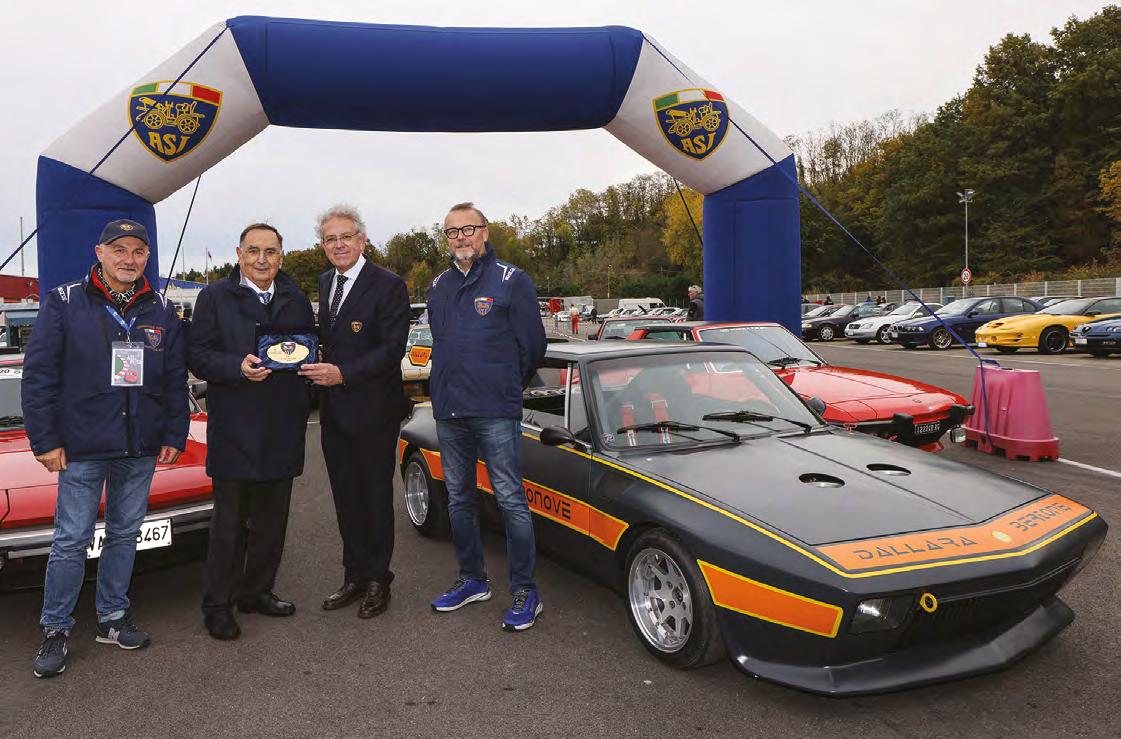 quI Sopra, La conSegna deLLa targa oro aSI aLLa daLLara IcSunonove: da SInIStra, vIttorIo vaLBoneSI (preSIdente commISSIone tecnIca auto aSI), gIampaoLo daLLara, aLBerto Scuro (preSIdente aSI), andrea BergamInI (referente aSI veIcoLI da competIzIone). neLLa pagIna a deStra, Le faSI deLLa SeSSIone SpecIaLe dI omoLogazIone aSI dedIcata aLLe auto StorIche da corSa.