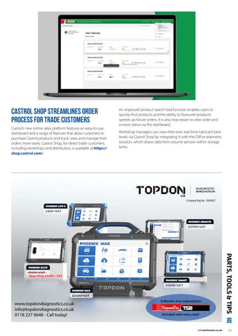 Castrol’s new online sales platform features an easy-to-use dashboard and a range of features that allow customers to purchase Castrol products and track, view and manage their orders more easily. Castrol Shop, for direct trade customers, including workshops and distributors, is available at https:// shop.castrol.com/
