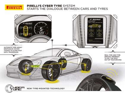 Being embedded within the tyre structure allows the Cyber Tyre software to include details about the tread compound, load index and speed rating. It also alerts pressures and temperatures deviations to the driver faster and more accurately. Under track conditions, the system instructs the driver when the safe maximum tyre speeds are reached and advises on the most appropriate tyre pressures for optimum track performance. It also provides instructions about post-race tyre cooling techniques. Pirelli sees the Cyber Tyre as an ideal technology for future everyday cars, including those fitted with 5G network communications. In November 2019, Pirelli showed this was possible, when it demonstrated TPMS sensors imparting road surface information at the world-first 5G enhanced ADAS event in Turin.