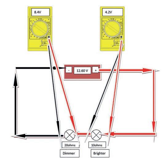 If the resistance values of the two bulbs inFigure 7 have di erent resistance values, then the voltage drop across each bulb would also have di erent values but would still add up to battery or system voltage of 12.6V: 8.4V +4.2V = 12.6V.