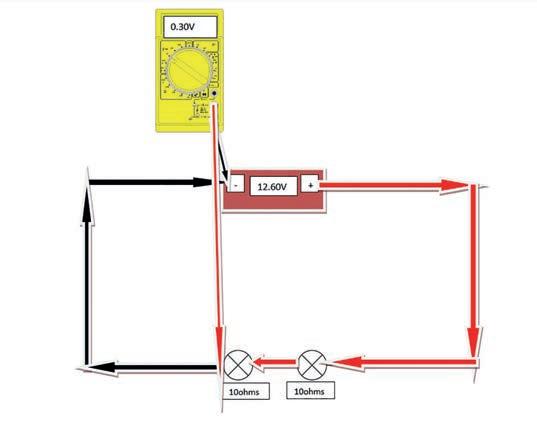 Black lead connected to the battery negative post and the red lead now connected to the output or earth/ground wire of the second bulb/resistor, 0.30V indicating a good earth/ ground to that circuit. Note that because each bulb is sharing the circuit voltage, these lights will not shine brightly as they only have half each of the system voltage, 6.30V each addingup to system voltage of 12.6V.