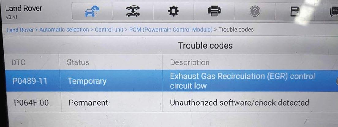 This proved, without a doubt, that the software had been modified, as the second code showed unauthorised software had been detected even though it was now back to standard software. Additionally, the EGR code had changed and now showed a circuit low code. After a short while, the found code that was logged when I first checked for trouble codes was also logged, so I could now move forward with diagnosing the problem. Rechecking live data now showed the ECU commanding the EGR to move, however, after a short period of idling, the position did not move as expected. The ECU then started increasing the percentage higher and higher until, finally, after not seeing a change at all after demanding 100 percent, it logged a fault code and shut off the EGR valve command. The reason the control unit does this is that it
