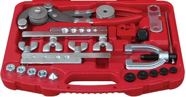 #4-40, #6-32, #8-32,#10-24, #10-32, #12-24 machine screw plug tap and 5/8” hex dies; 1/4”-20, 1/4”-28, 5/16”-18, 5/16”-24, 3/8”-16, 3/8”-24, 7/16-14, 7/16”-20, 1/2”-13,1/2”-20 fractional plug tap and 1” hex dies; M3x0.5, M4x0.7, M4x0.75, M5x0.8, M5x0.9, M6x1 metric plugs taps and 5/8” hex dies; M7x1, M8x1,M8x1.25, M9x1, M9x1.25, M10x1.25, M10x1.5, M11x1.5, M12x1.5, M12x1.75 metric plug taps and 1” hex dies; 1/8”-27 NPT and 18-/8”-28 NPT pipe thread plug taps and 1” hex dies; adjustable die stock for 1” dies; plain die stock for 5/8” dies; adjustable handle tap wrench for taps 1/4”–1/2”; 2-in-1 tap wrench for taps 1/4”–1/2”; t-handle tap wrench for taps #0–1/4”; metric thread pitch gauge; fractional thread pitch gauge; molded case