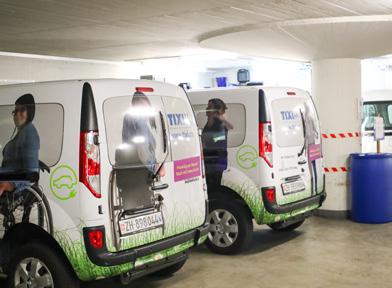 26 VW Caddy, 2 Renault E-Kangoo sowie 2 neuen Opel Zafira-e und wird von Andreas Egli, Leiter Fuhrpark, verantwortet. «Im Durchschnitt ist ein Tixi-Fahrzeug fünf bis sechs Jahre im Einsatz, transportiert rund 13 500 Fahrgäste und legt dabei ca. 260 000 Kilometer zurück», erzählt uns Andreas Egli. Noch wird die Mehrheit der Fahrzeuge konventionell angetrieben. Bis 2026 sollen aber bereits zwei Drittel des Fuhrparks elektrifiziert vorfahren. Erste Erfahrungen mit der E-Mobilität sammelte Tixi Zürich bereits 2013. Damals spendeten die Elektrizitätswerke des Kantons Zürich zwei speziell für den Rollstuhl- transport umgebaute Elektroautos. Bei den E-Mobilen handelte es sich um eine technologische Innovation, bis dahin existierten keine geeigneten Elektrofahrzeuge für einen Behindertenfahrdienst. Doch ehe die Vehikel einsatzbereit waren, musste ein Fahrzeugumrüster gesucht werden, der sich dieses Novums annahm. Fündig wurde man schliesslich in den Niederlanden. Heute wird die gesamte Flotte in der Schweiz umgebaut.