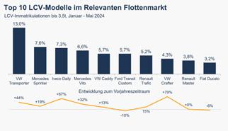 Von der erhöhten Nachfrage profitieren im Flottenmarkt vor allem die NfzSparten von VW (+54,7 %) und Mercedes (+33,7 %), die sich im Mai deutlich von den anderen Importeuren absetzen konnten. Renault egalisierte im abgelaufenen Mai seine Vorjahreszahlen, während Ford den Absatzrückgang im Flottenmarkt weiterhin nicht stoppen kann (–15,6 % im Mai, –23,0 % kumuliert).