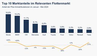 Nummer vier im Markt war im Mai Mercedes, deren Flottenzulassungen um 9,0 % zulegten. Deutliche Zuwächse gelangen ausserdem Porsche (+60,6 %), SEAT (+42,7 %) sowie Kia (+68 %) und Dacia (+49 %). Demgegenüber brachen die Flottenimmatrikulationen von Peugeot regelrecht ein. Der siebtplatzierte aus dem Mai 2023 verlor über 80 % seines Volumens aus dem Vorjahresmonat, wodurch die Marke auf Platz 21 abrutschte. Herbe Verluste musste auch