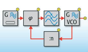 Bild 5. Phase Locked Loop (PLL). Der Regelkreis zum Konstanthalten der Frequenz. 1 Piezo-Oszillator – 2 Phasenlage- und Frequenzvergleicher – 3 Tiefpassfilter – 4 spannungsabhängiger Oszillator – 5 Frequenzteiler.