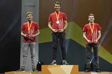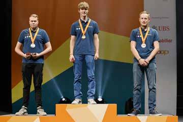 automobile s’est brusquement ac céléré: la cérémonie de remise des prix aux carrossiers tôliers et tôlières était sur le point d’avoir lieu. Sous les applaudissements, les responsables ont annoncé le trio gagnant de cette catégorie: RobinTaramarcaz (Darbellay Carrosserie, VS) remporte l’or, Marco Müller (Carrosserie Feller AG, BE) l’argent et Jan Kammermann (Carros serie Vitali+Müller AG, LU) le bronze. Comme précédemment, la joie des trois meilleurs était sans limites. «Je suis super heureux. C’est le plus beau jour de ma vie», a ensuite déclaré Robin Taramarcaz. Il a certes fait une ou deux petites erreurs pendant la compétition, par exemple lors de la soudure, mais dans l’ensemble, tout a bien fonctionné. Il va maintenant certainement fêter sa victoire comme il se doit.